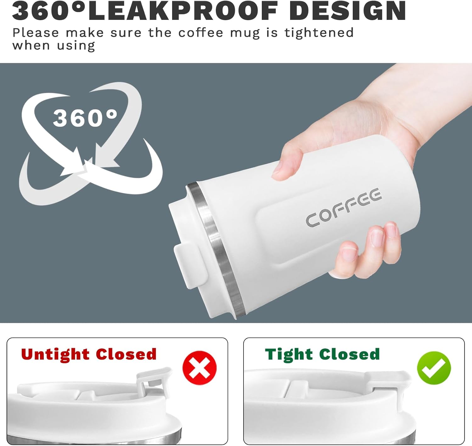 - Leakproof and Spill-proof: The stainless steel coffee mug come with a screw-on sealed lid that ensures your drink won't spill if it's knocked over or stored in a bag. The lid has a tight seal with a sealing ring to prevent leaks and spills, and it is easy to screw on and off. The drink hole on the top makes sipping easy and convenient.