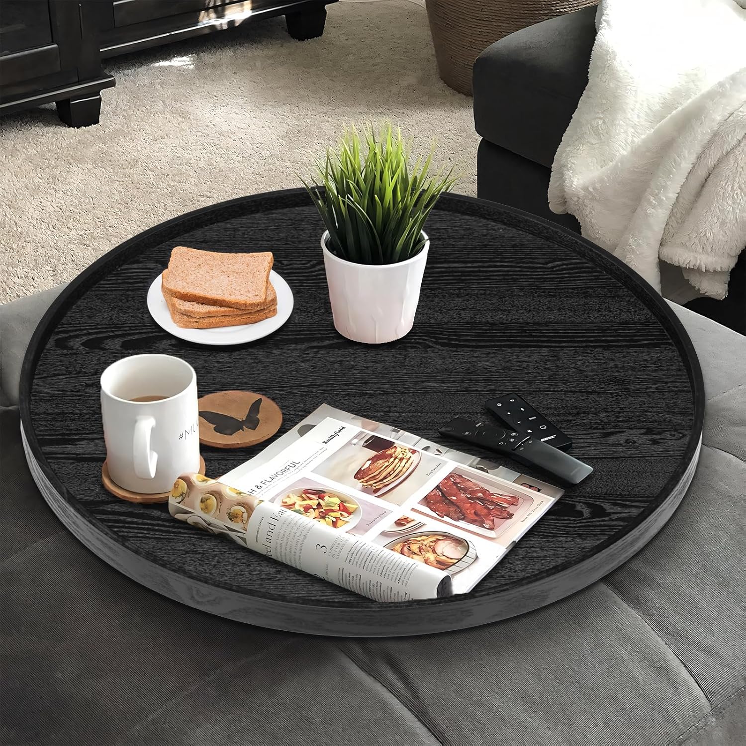 - 【With Raised Edges】Versatile serving tray, with raised edges to prevent spillage of your favorite food and drink, and it is easy to hold.black round display tray. Perfect smooth surface and color makes it looks great in your restaurant or your home, modern and elegant.black round wooden coffee table tray.