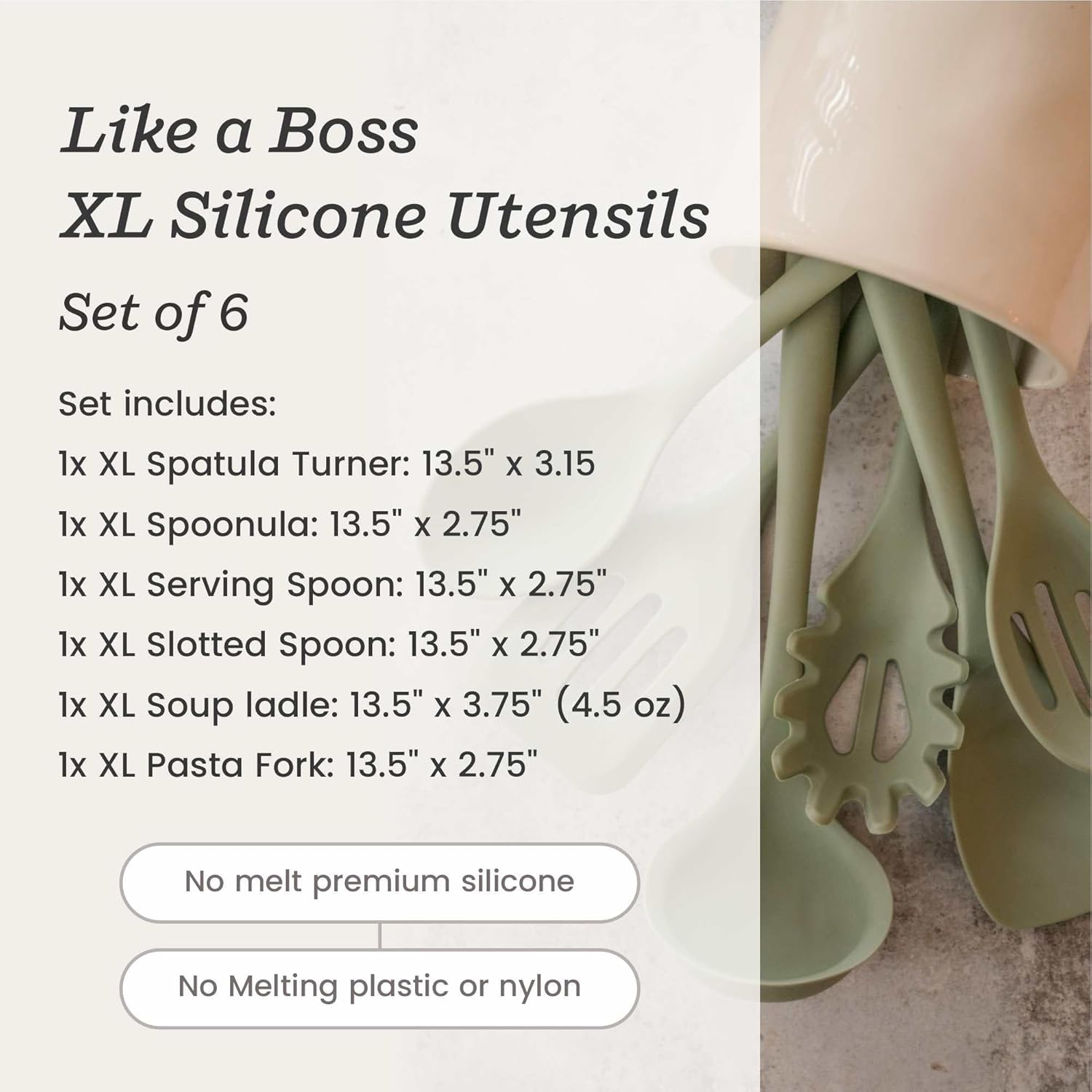 - For When You Want to Cook like a Boss: Our XL silicone utensil set features 6 of our bestselling kitchen tools - upsized!.Hygienic one-piece design, high heat resistant to 600°F, non scratch and safe for all types of nonstick cookware including ceramic.