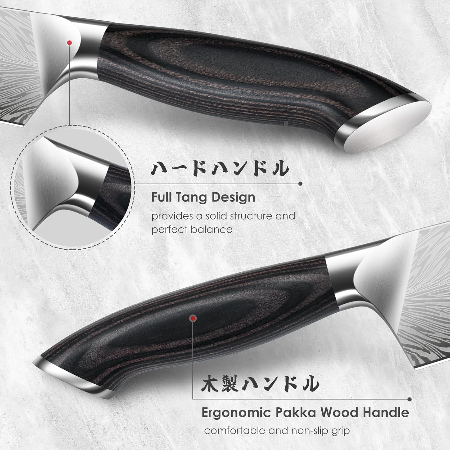 - High-Quality Japanese Powder Steel: The SHAN ZU Knife Set is made from high-carbon Japanese powder steel with a hardness rating of 63HRC, making it tougher than 99% of standard steel. Processed using advanced metallurgical techniques, these knives guarantee exceptional durability and longevity, ensuring they remain reliable kitchen companions for years to come