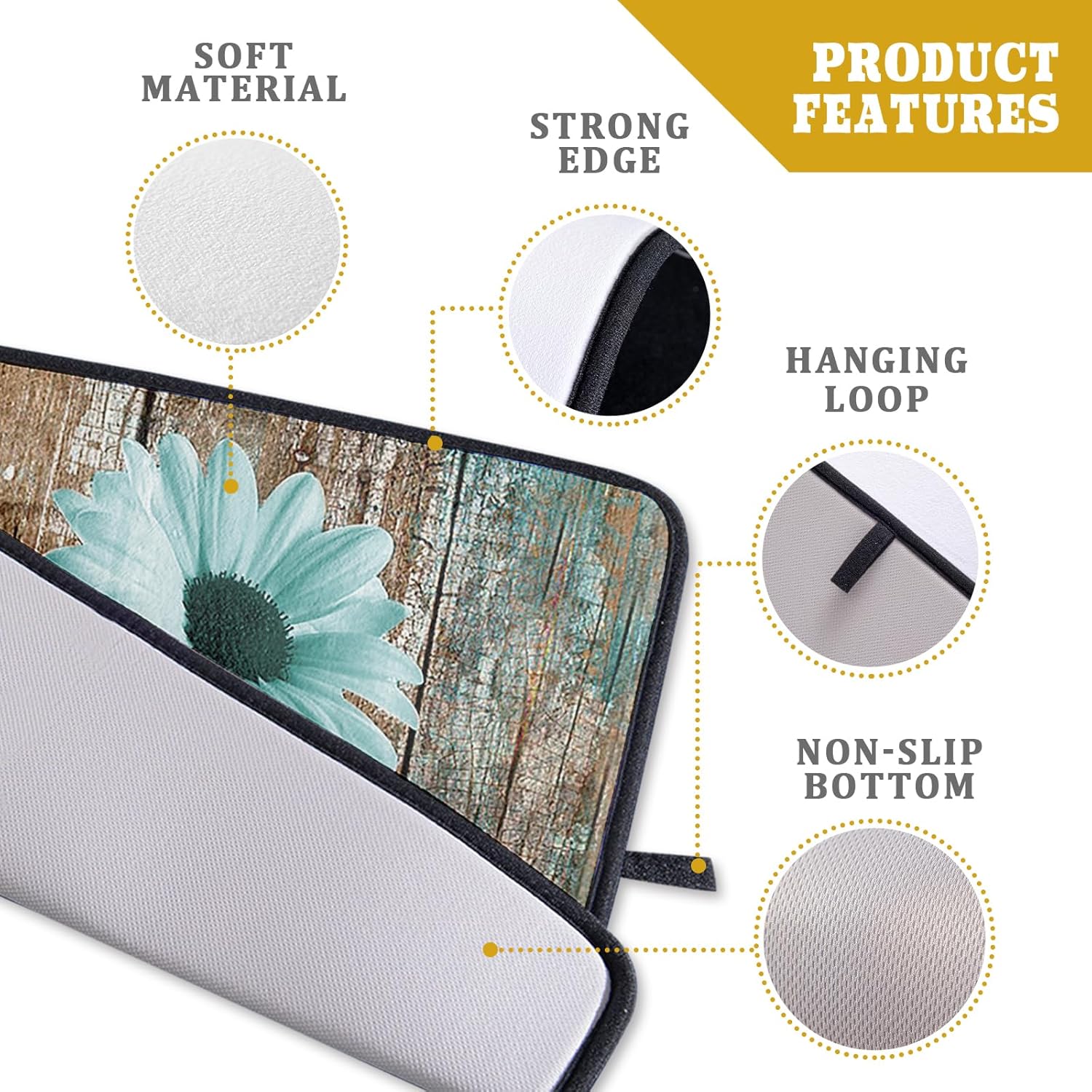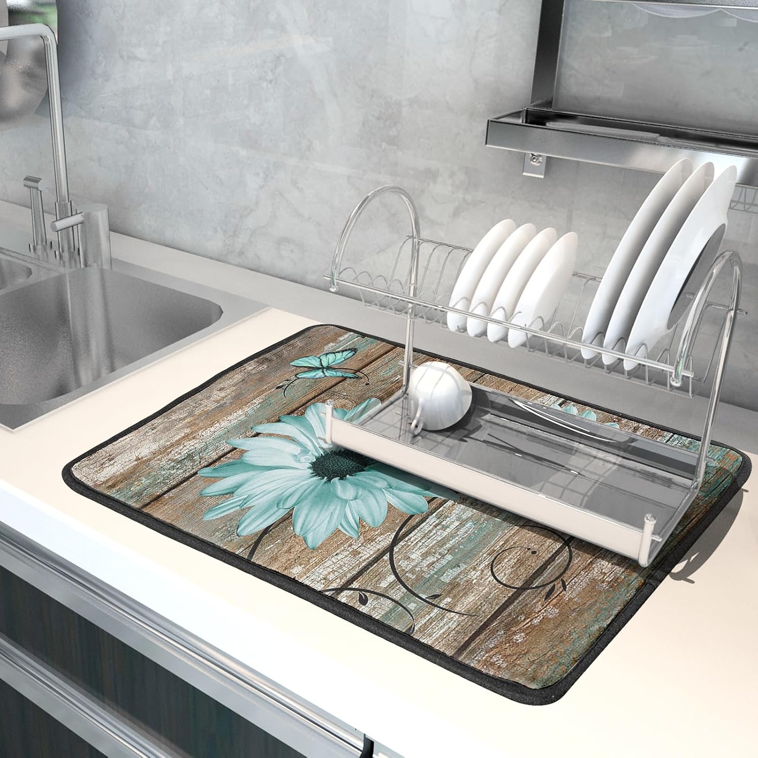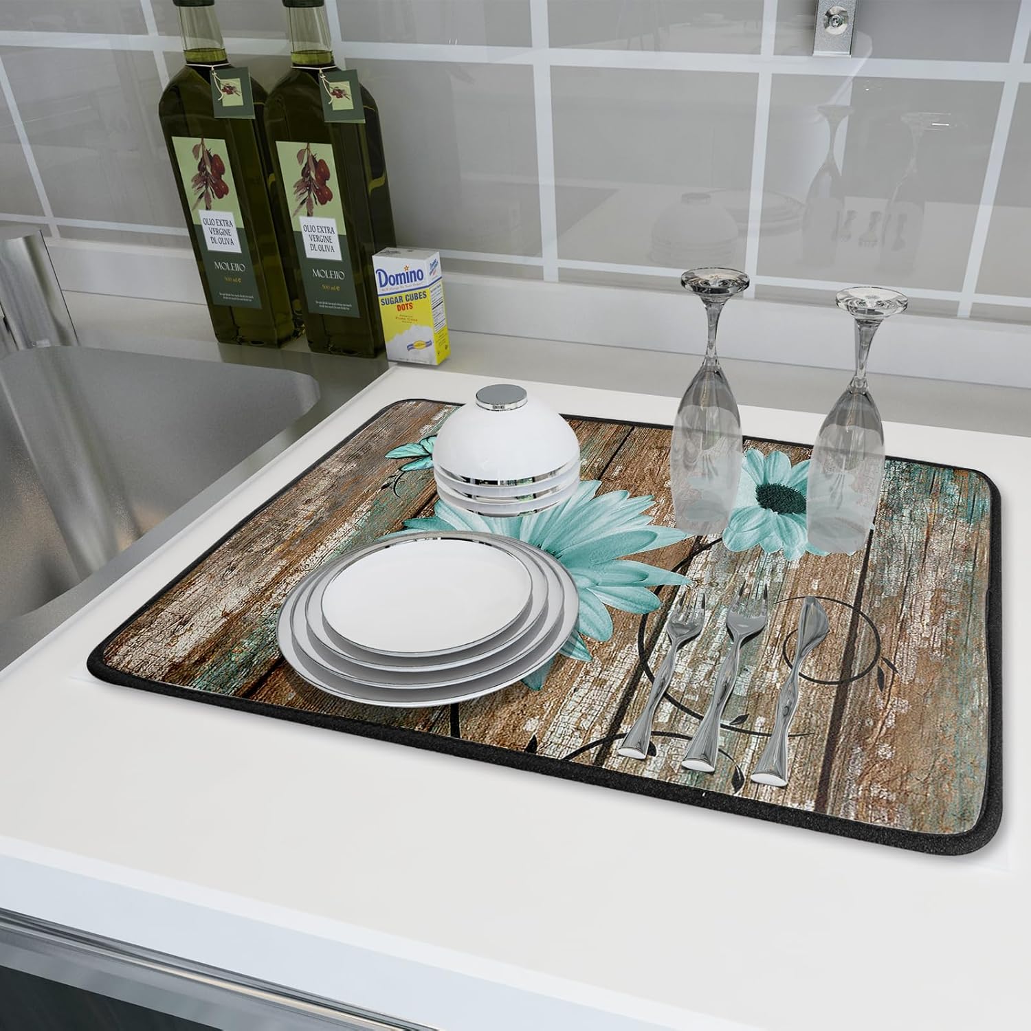 Rustic Daisy Dish Drying Mat for Kitchen Countertop 18x24 inch Teal Sunflowers on Wooden Board Dish Drainer Mats Fast Drying Country Vintage Style Shabby Chic Flower Dish Drying Pad Decor Large