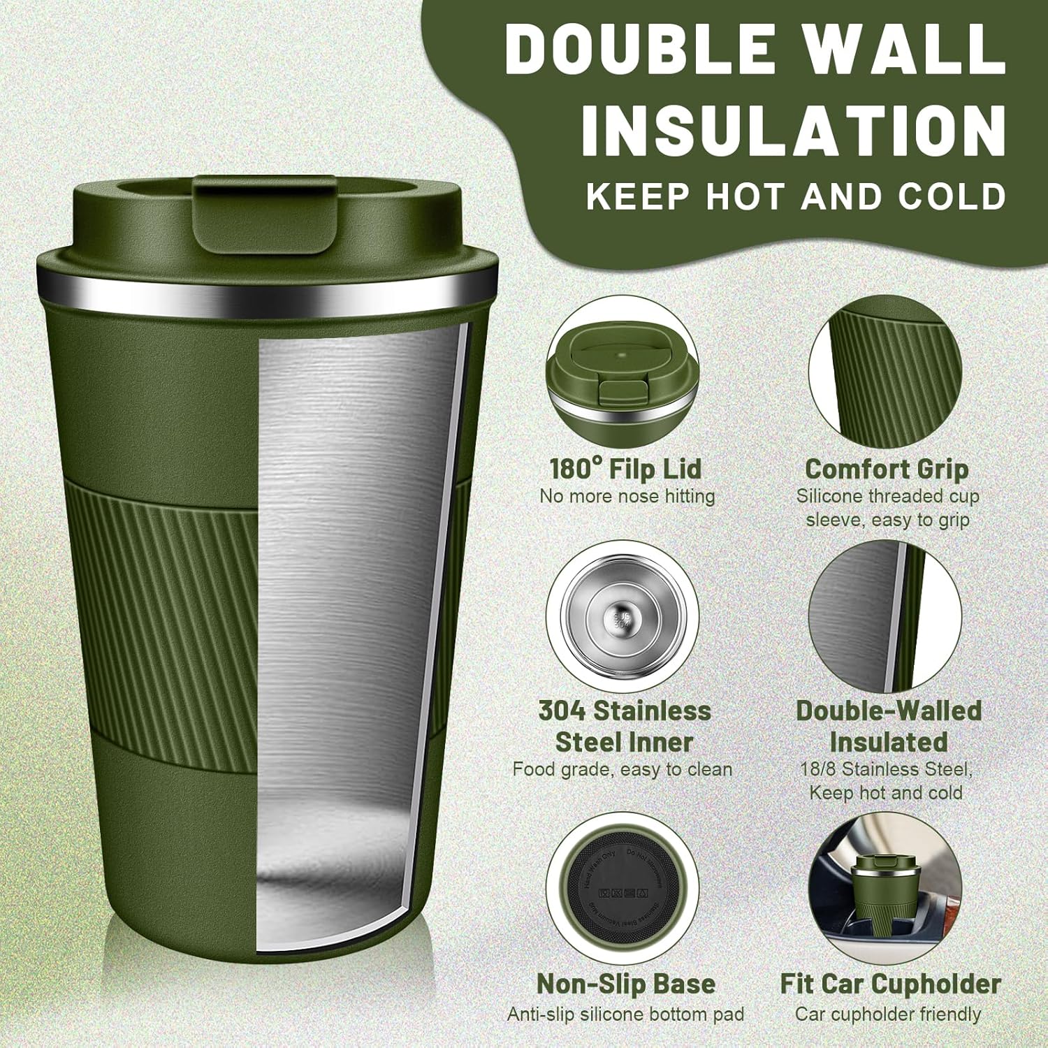 - Easy Clean & Comfort Grip: The large-opening design make insulated coffee tumbler mug easy to clean, the travel coffee mug comes with an eco-friendly one-hand flip-top snap, spiral silicone sleeve for easyily carry out, makes drinking with one hand comfortable and secure, sealing silicone strip and a screw lid design to prevent spills.