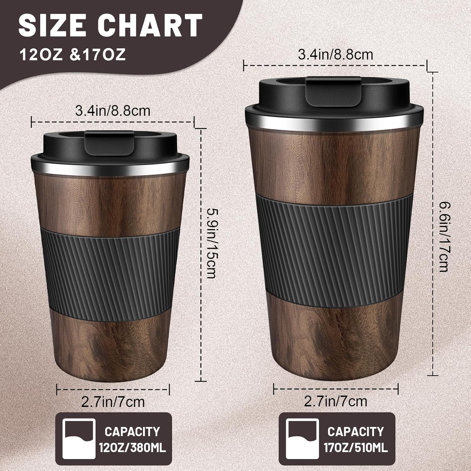 - Ideal Size for Coffee Machine & Car Cupholder Friendly: Coffee tumbler has 2 size-380ml/12oz & 510ml/17oz, and muti-color to choose from, portable size for home use, on-the-go, trip, to work carrying coffee, car cupholder friendly design make coffee mug a ideal choose in travel on the go.