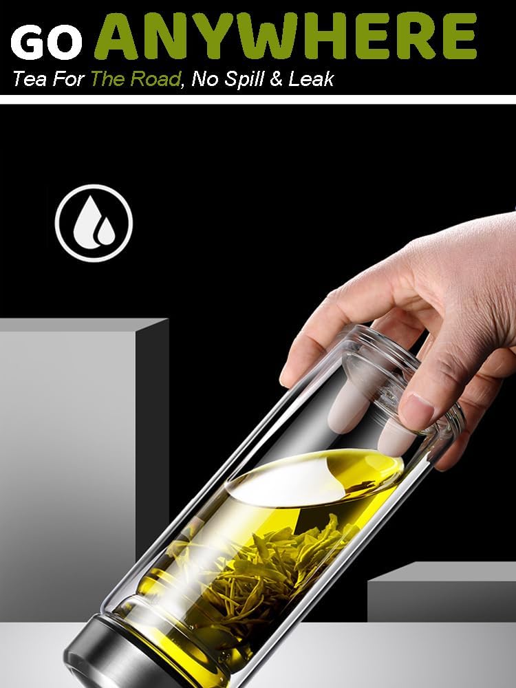 - [Leakproof & Thick Bottom Design] Our double-walled glass tea tumbler is odor-free, sweat-free, and leakproof, so you can take it with you anywhere without worrying about spills or leaks.
