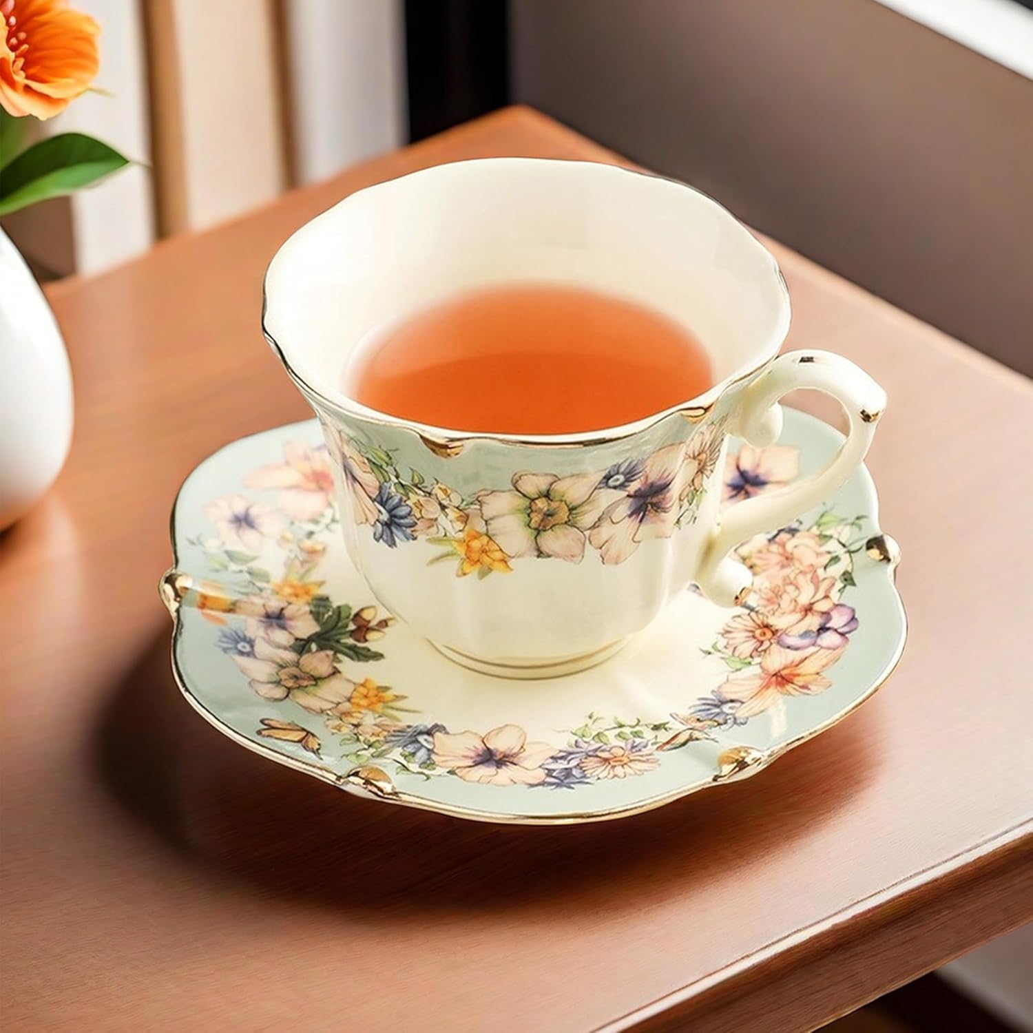 - 8.5 Ounce Bone China Porcelain Tea Cup and Saucer, Assorted colors, Floral Pattern, Set of 1