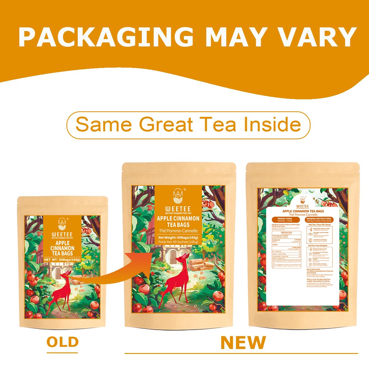 WT WEETEE Apple Cinnamon Herbal Tea Bags, 60 Count, Perfect Blend of Sweet Cinnamon, Tart Hibiscus, Natural Flavoring, Caffeine-Free