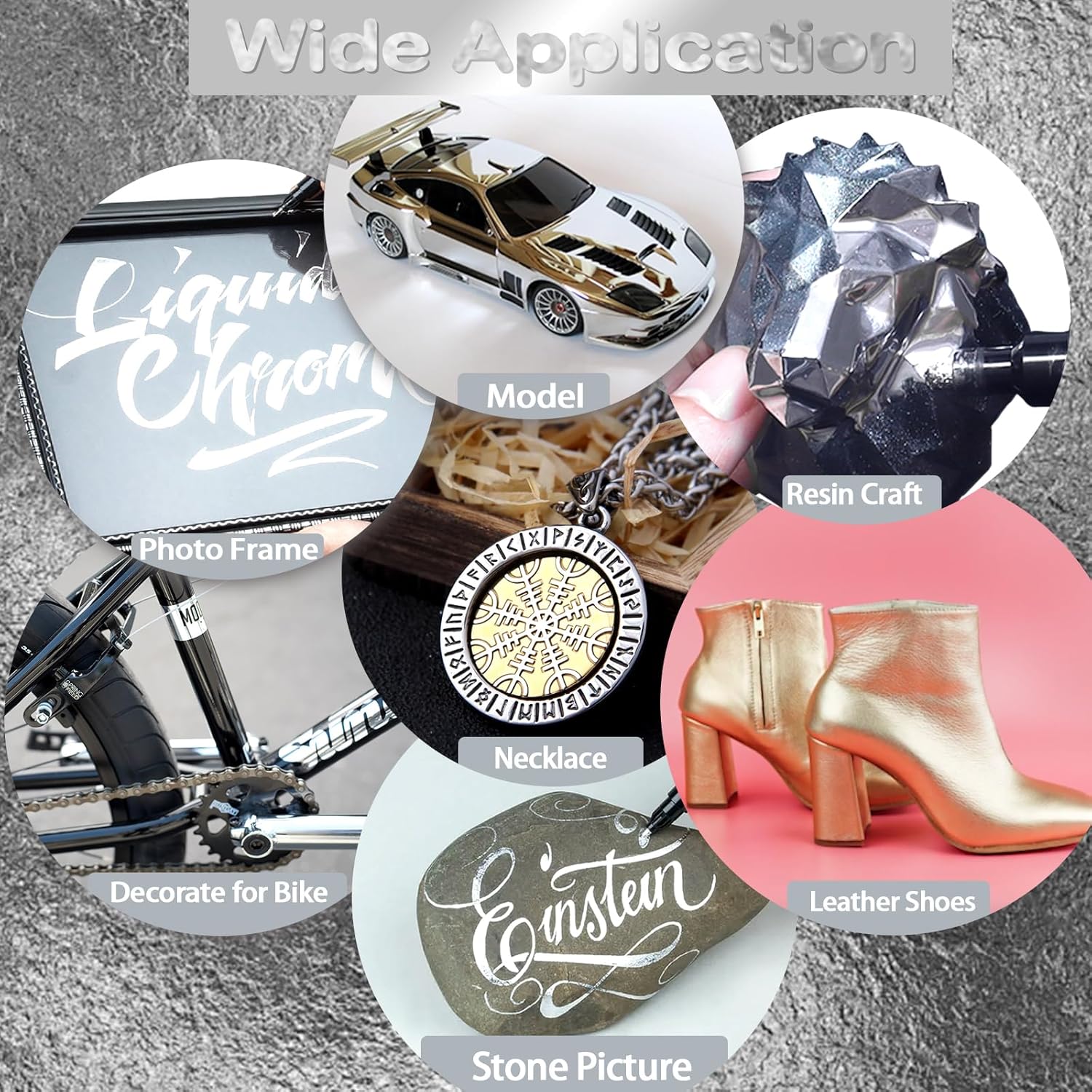 - Wide Applications &Professional Mirror Repairs - Dual tip chrome paint pen are suitable for craft making, model painting, personalized writing, card making, painting and graffiti. Chrome pen marker show a bright metallic sheen on resin molds silicone, mirror, paper, plastic, glass, wood, ceramic, and metal. And chrome markers can be used to apply in jewelry making, accurately restore chrome in automotive Logo, car wheel and furniture restoration. Metallic pens is suitable for creative design and professional restoration.