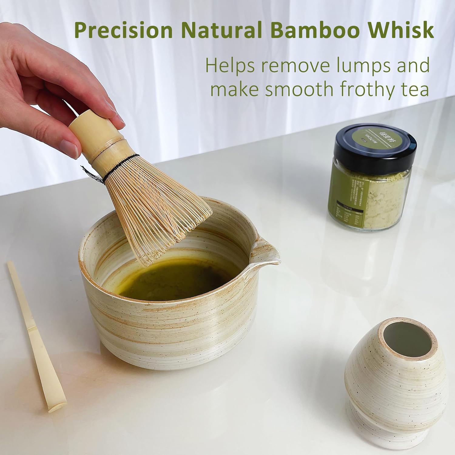 - EXQUISITE 100 BRISTLE BAMBOO WHISK: Our matcha whisk has 100 exquisite teeth, which can achieve fast and thorough stirring and full mixing, making the whole matcha making process simple to produce a luxurious frothy texture, bringing a silky and smooth matcha experience. The bamboo scoop can not only scoop the tea powder, but also scrape off all the residue in the bowl. The ceramic whisk holder can be used to fix and dry the whisk and restore it to its original shape