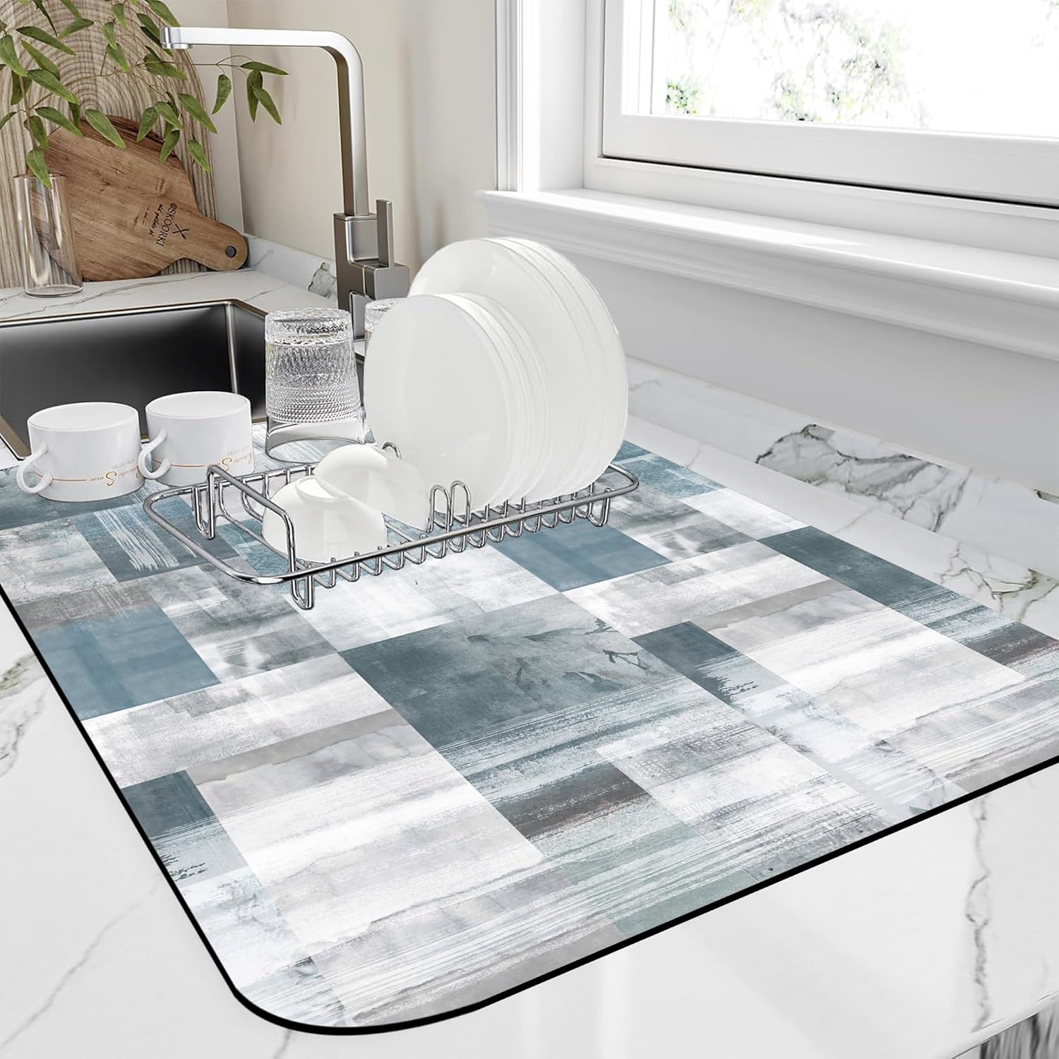 Dish Drying Mat Blue Grey Abstract Art Dish Drying Pad,16"X24" Bsorbent Coffee Mat for Sink Dishes or Under Rack Kitchen Counter Accessories Absorbent Hide Stain Rubber Backed Drying Mat