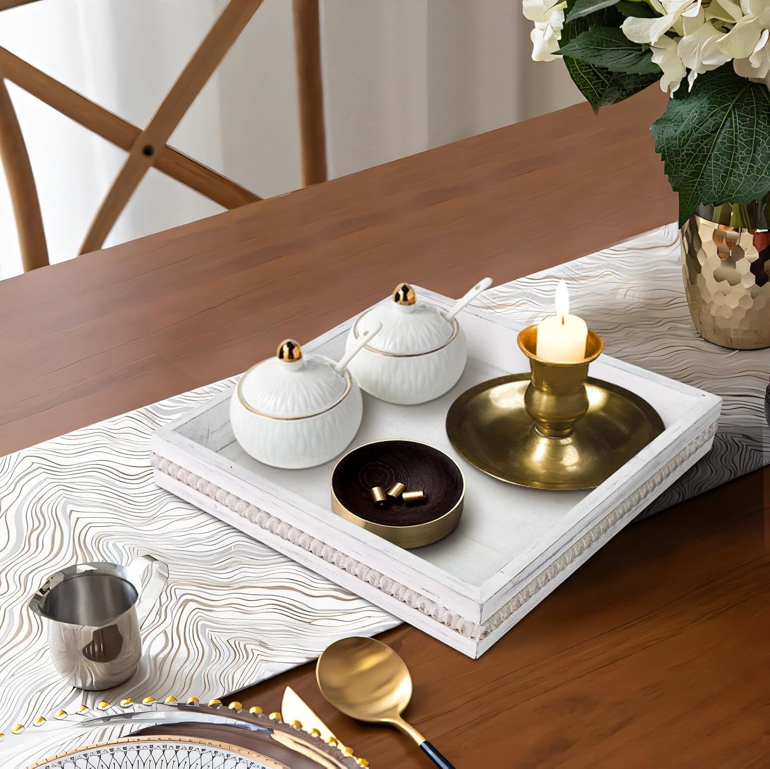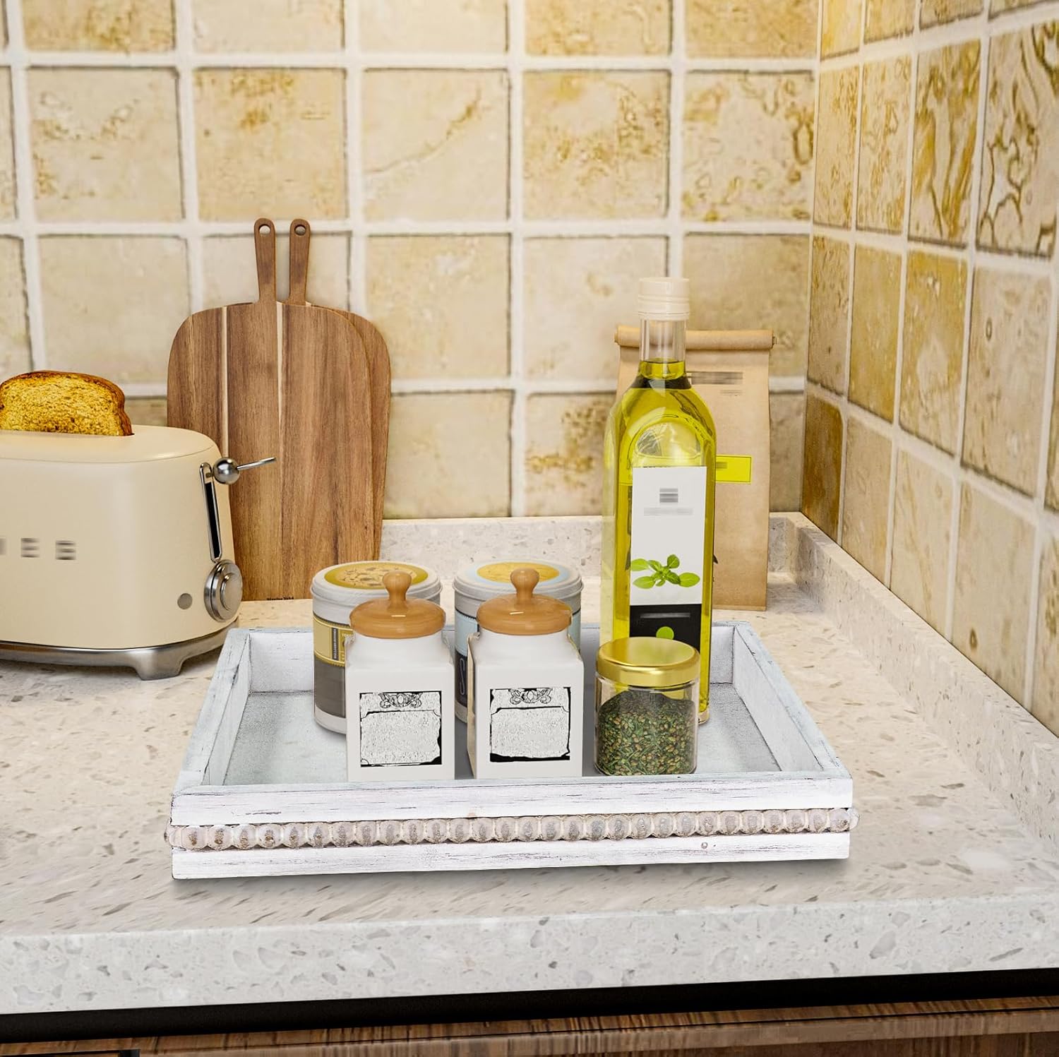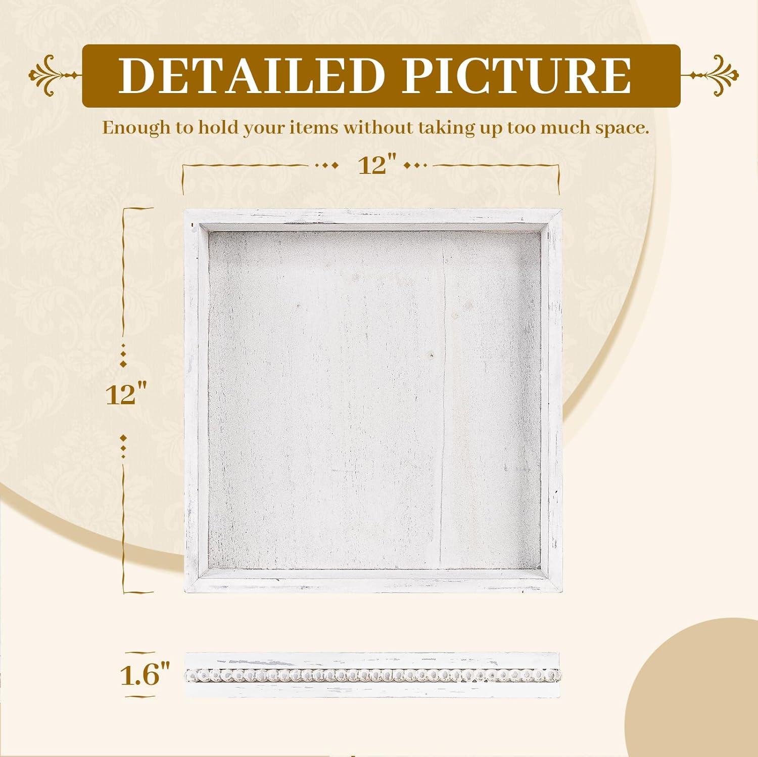 - REFINED AND ELEGANT: Sqaure serving tray is vintage white finish and the edges are decorated with wooden beads, the distressed surface gives it a homey vintage feel. The overall appearance is unique and exquisite that goes well with many types of decor, create a fun centerpiece for your space.
