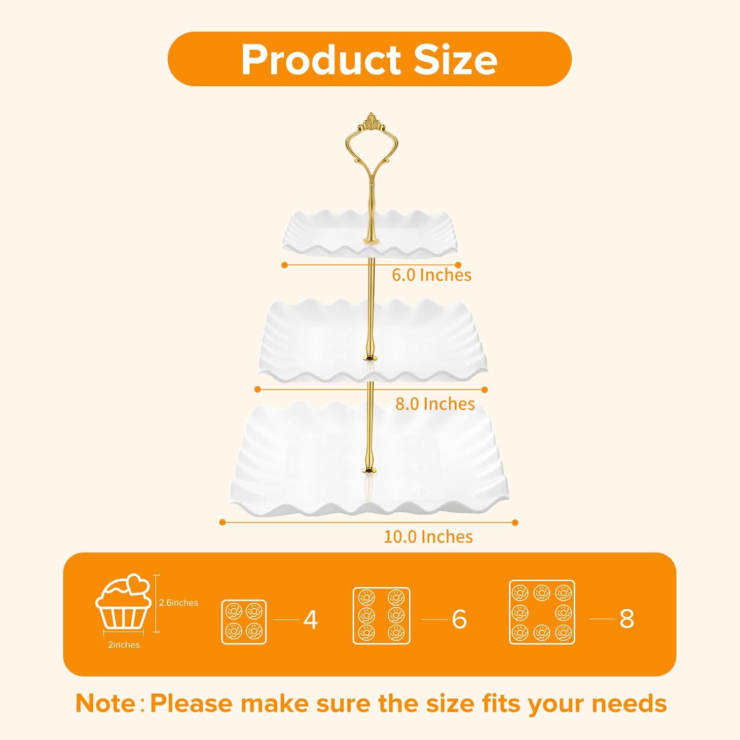 - Design to Hold 18 Cupcakes: The 3 tier serving trays measure 5.7, 7.7, and 9.5 inches in diameter, with a height of 13 inches. It can hold up to 18 standard cupcakes. Please ensure the size fits your needs before purchasing