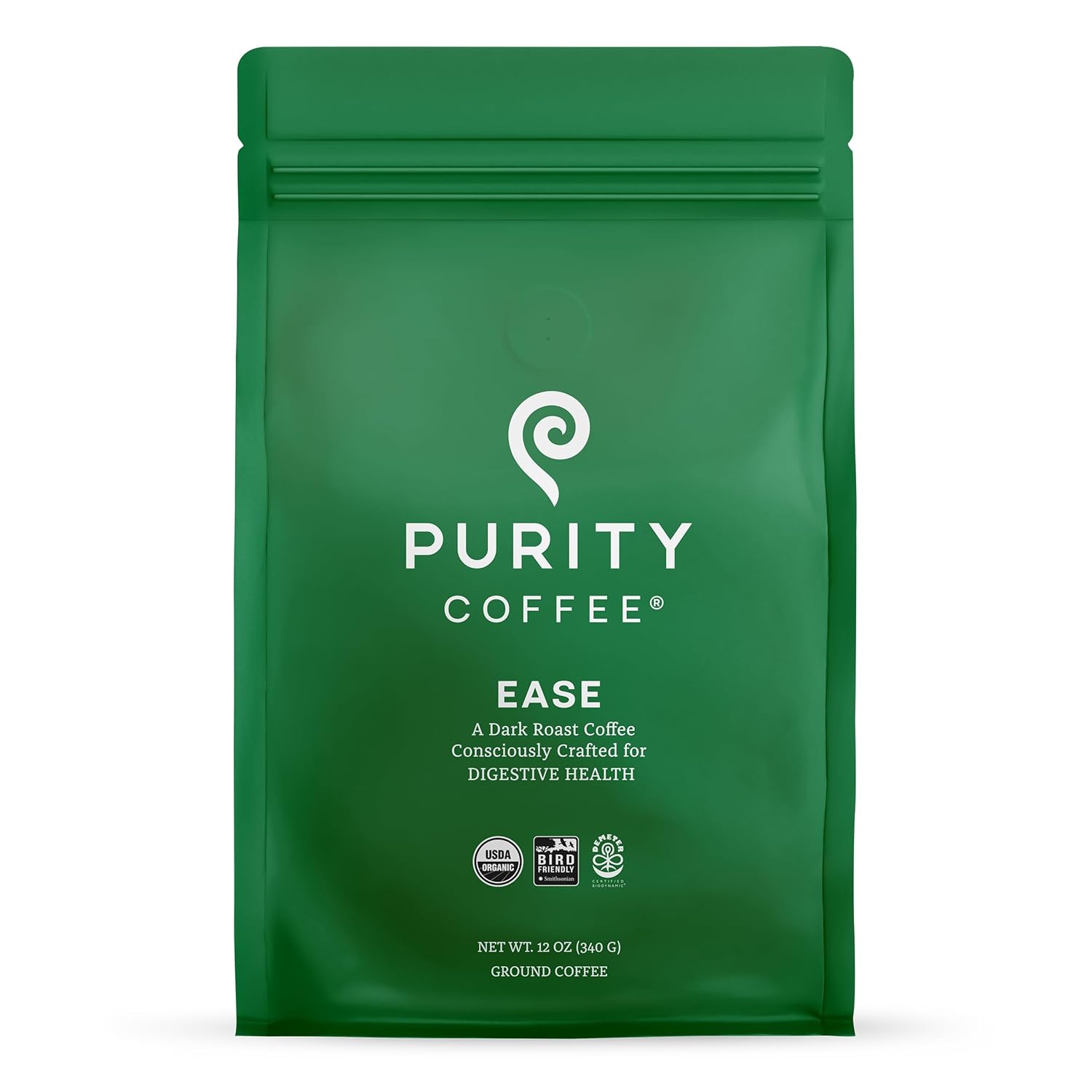 Purity Coffee EASE Dark Roast Ground Coffee for Low Acidity - USDA Organic and Third-Party Tested for Antioxidants, Mold, Mycotoxins and Pesticides - 12oz (Purity Ease, dark_roast) | Ground| EASE