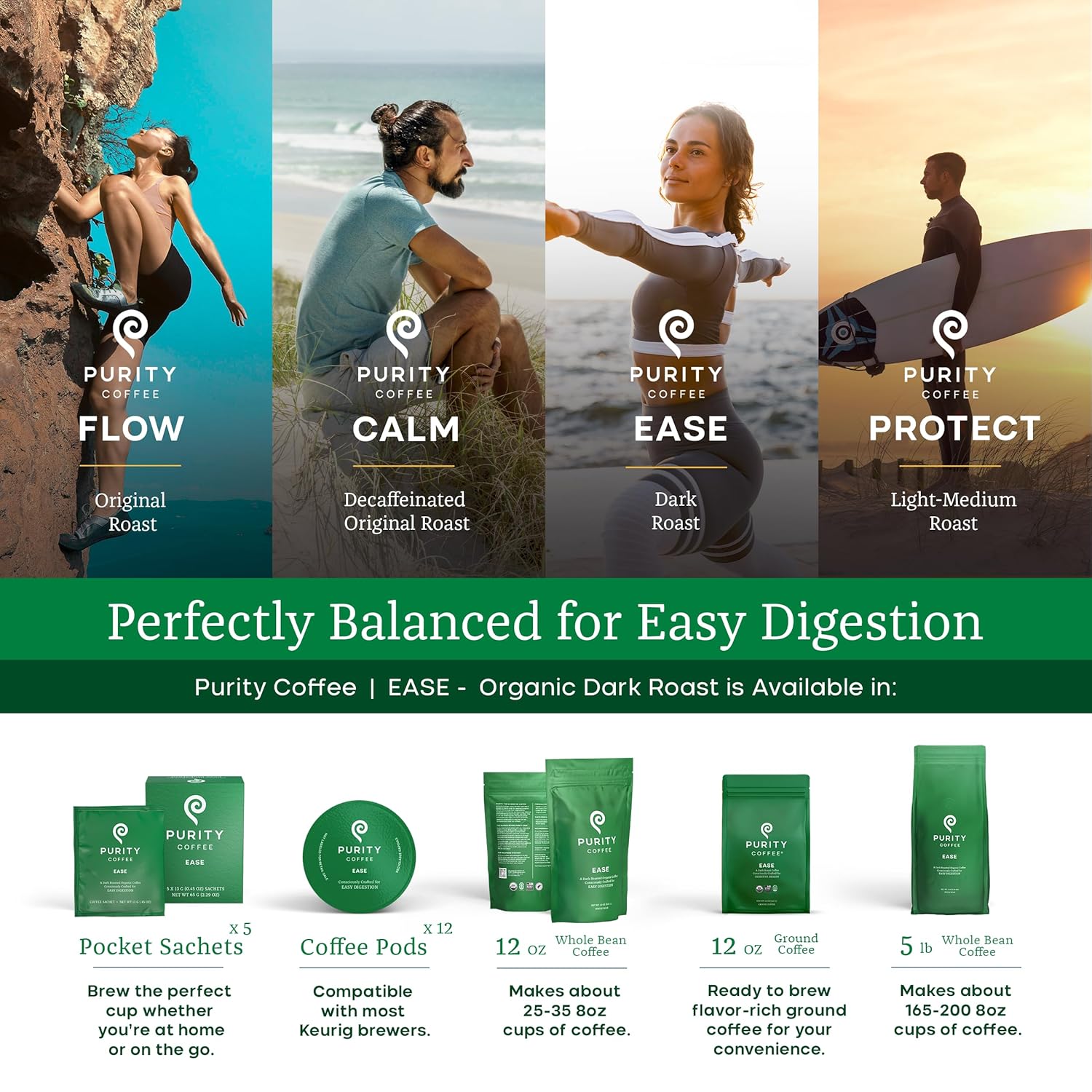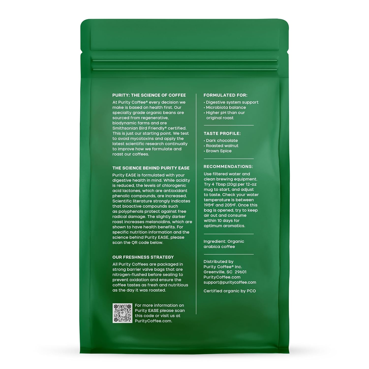 - Dark Roast Coffee for Your Digestion: Your favorite low-acid Purity Coffee now in organic dark roast ground coffee. Formulated with your digestive health in mind, this is the perfect balance of high levels of antioxidants and beneficial prebiotic compounds that help support gut health.
