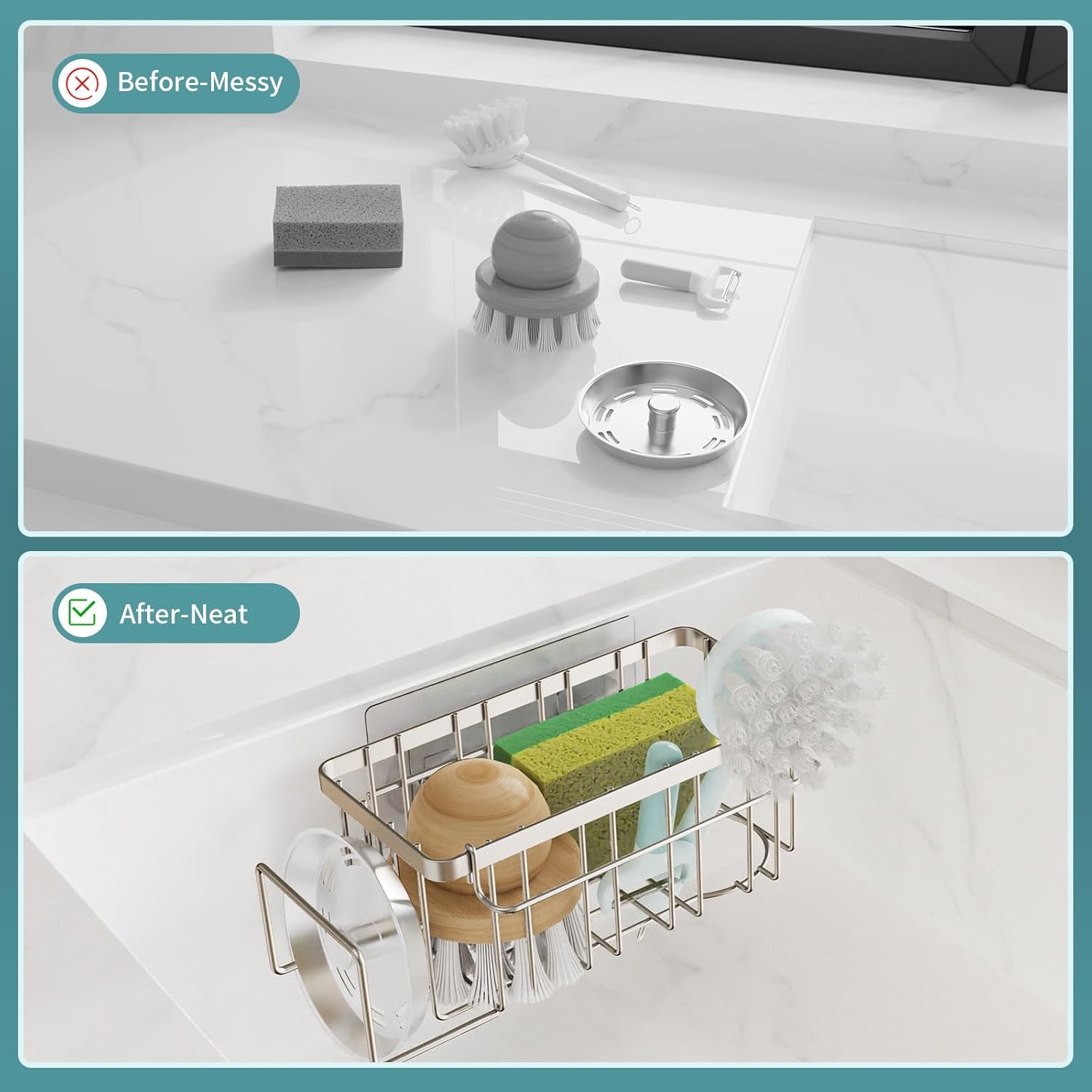 StorageRight 4-in-1 Sponge Holder for Kitchen Sink, Kitchen Organizers and Storage with Adhesive Hook & Suction Cups, Rustproof Sink Caddy for Kitchen Decor, Kitchen Sink Organizer - Silver
