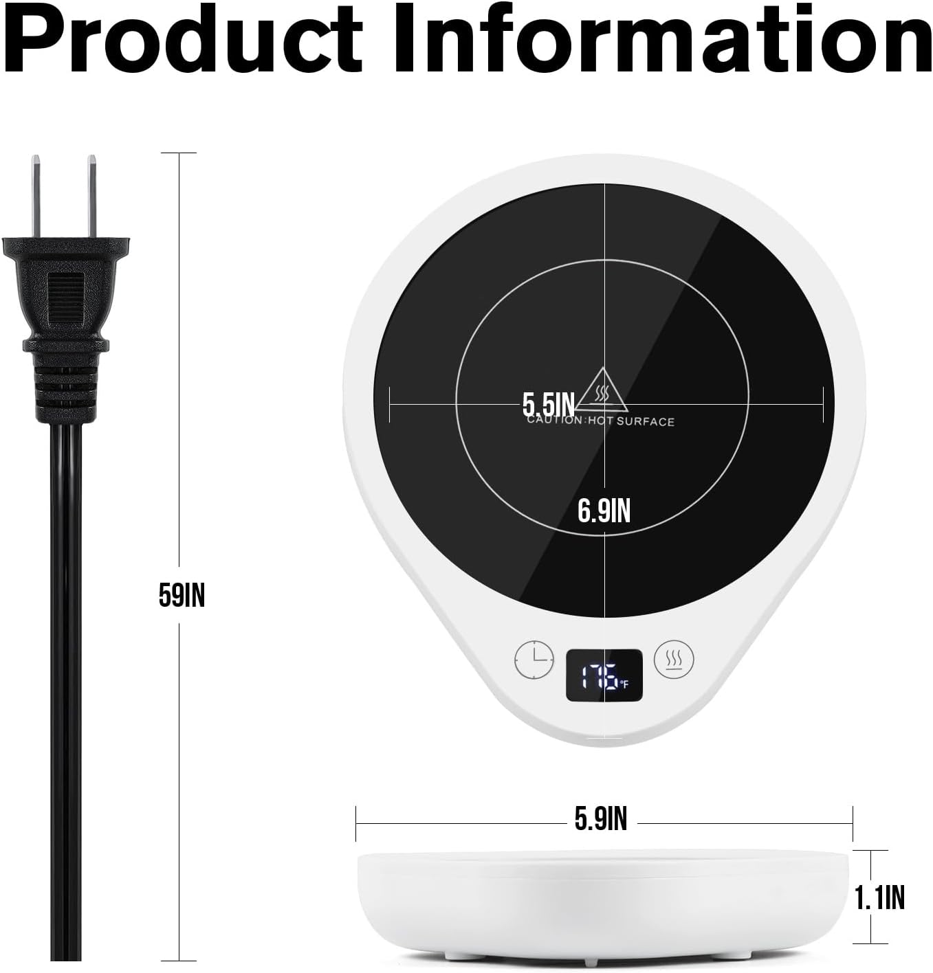 - [Super Larger Heating Area]-The coffee/candle warmer plate is 5.5 inches in diameter, super large heating area, fitting most cups and candles. Perfect for heating candle and beverages as coffee, milk, tea, etc. This cup warmer has rubber non-slip foot pad, stable and not easy to slip off.