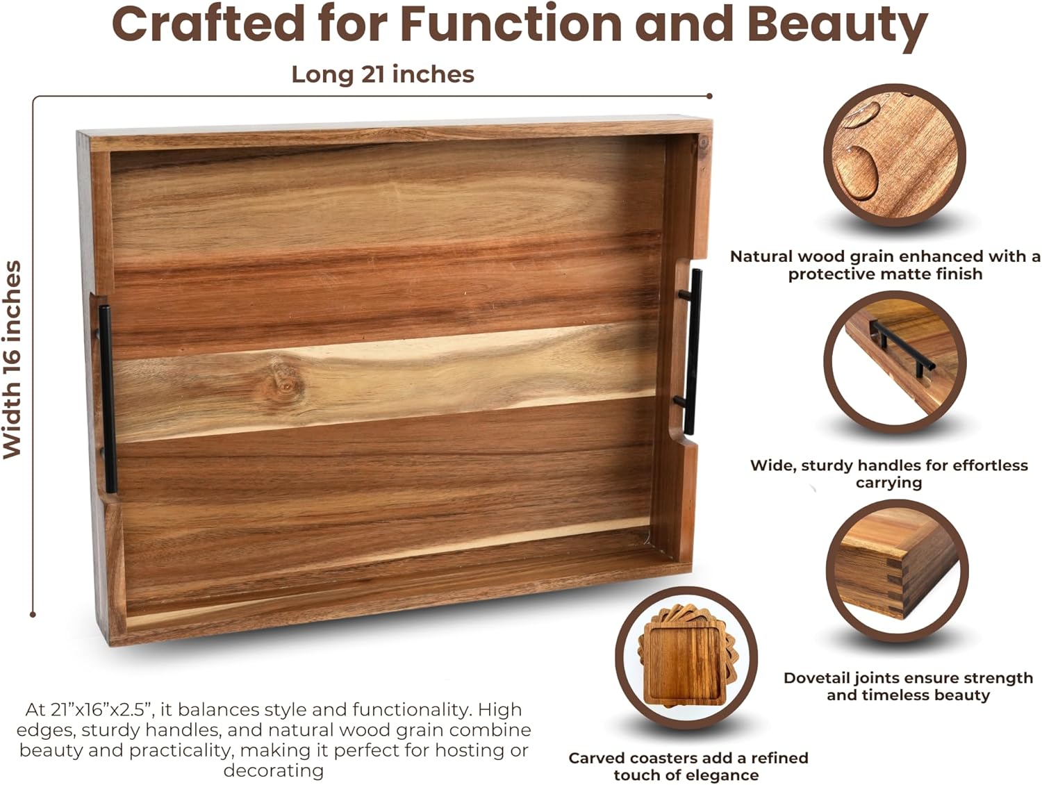 Acacia Wooden Ottoman Tray for Living Room & 6 Coasters Set – 21" Large Coffee Table Serving Tray with Handles, Perfect for Food, Drinks, Kitchen, and Home Decor