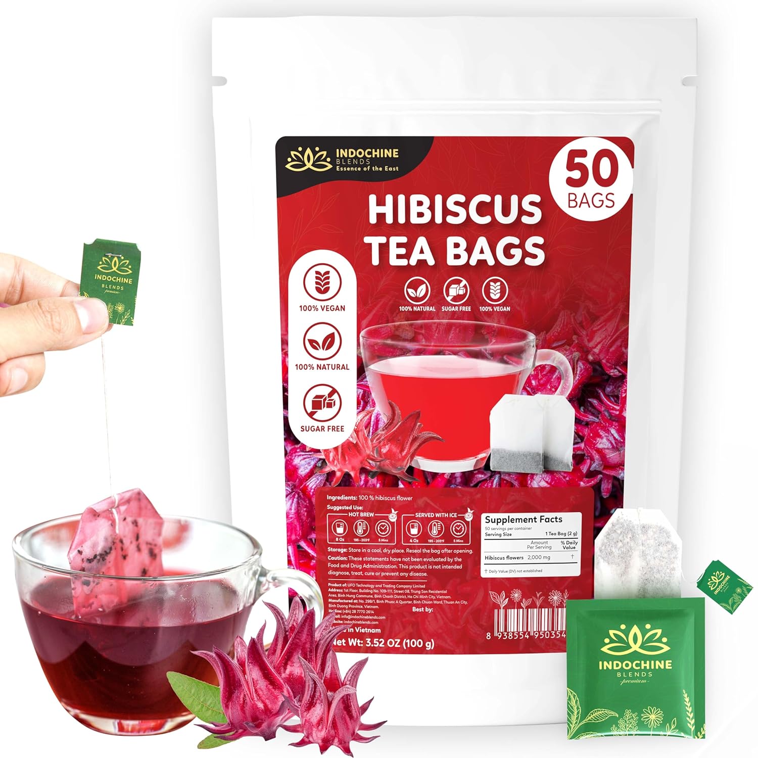 Indochine Blends Hibiscus Tea Bags | 100% Pure Hibiscus Flower | Sugar-Free, Caffeine-Free Herbal Tea | Double Chamber, Individually Wrapped Tea Bags| Rich in Natural Goodness and Flavor | 3.5 oz | 50 Tea Bags