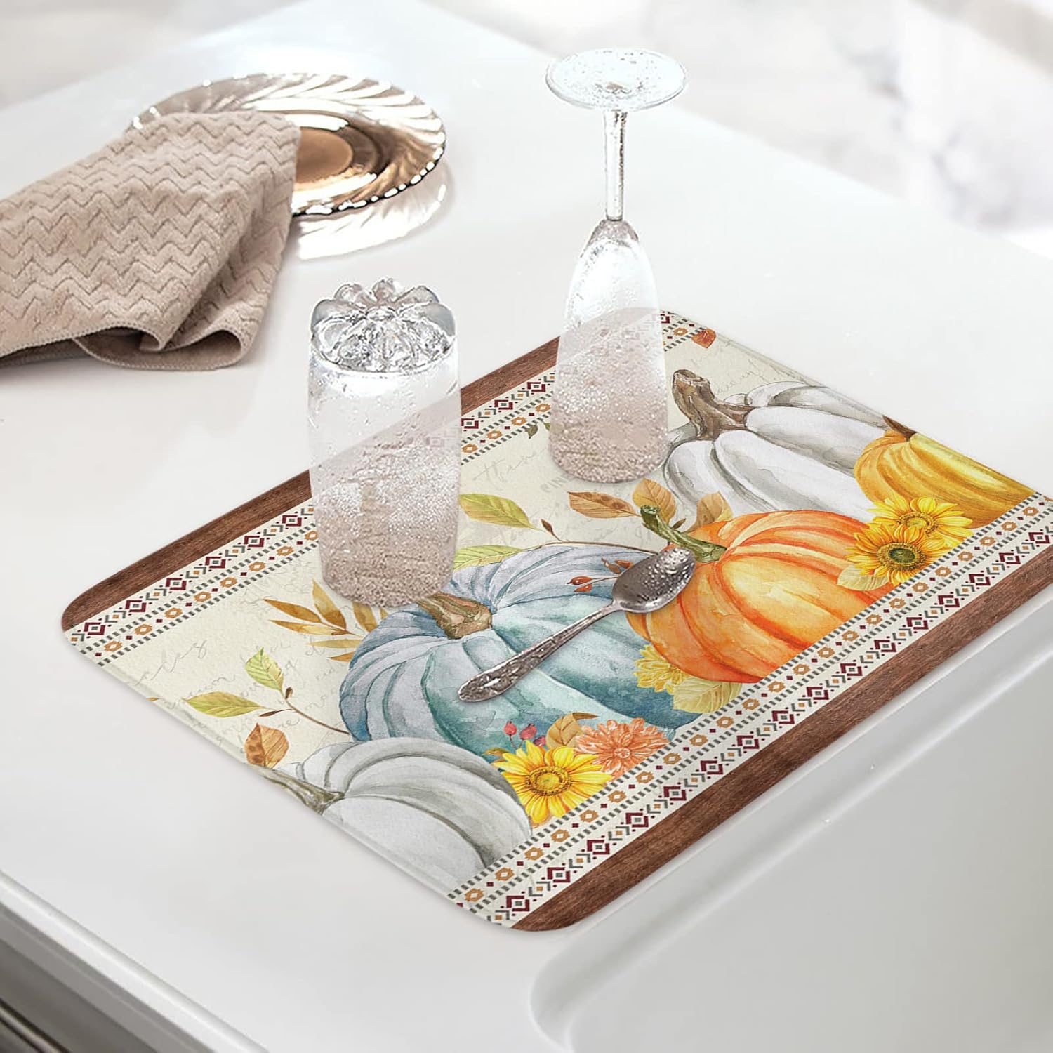 - Fall & Thanksgiving Decor - Pumpkin with sunflower maple leaves drying mats can add an chic holiday vibe and charm to your kitchen or coffee bar counter. The drying mat for kitchen counter with a unique hanging rope design that can be hung without occupying any space.