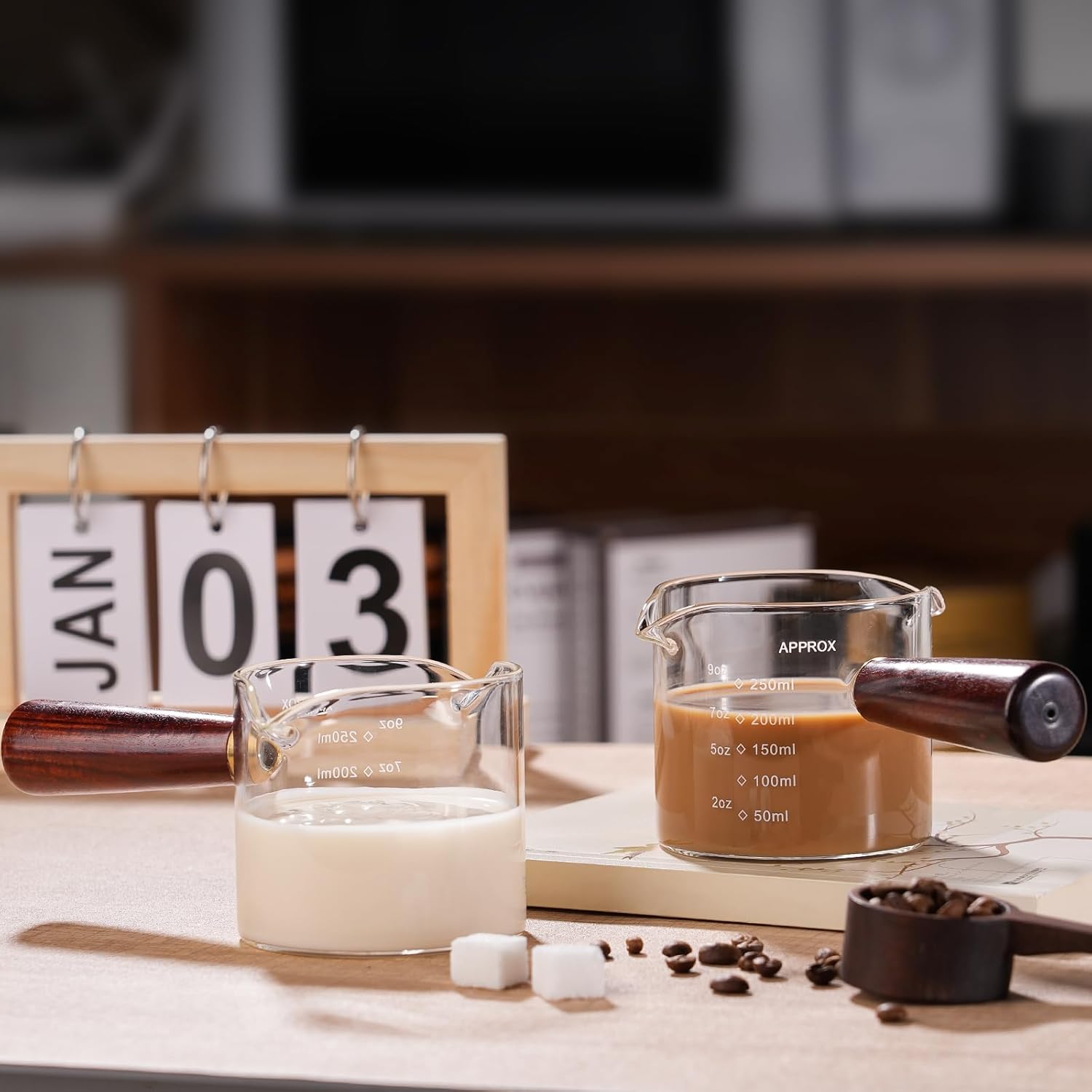 250ML/8.5OZ Measuring Cup Espresso Shot Glasses Double Spouts Large Coffee Cup with Wood Handle Triple Pitcher Milk Cup Parts Clear Glass By BCnmviku (250ml-1pack)