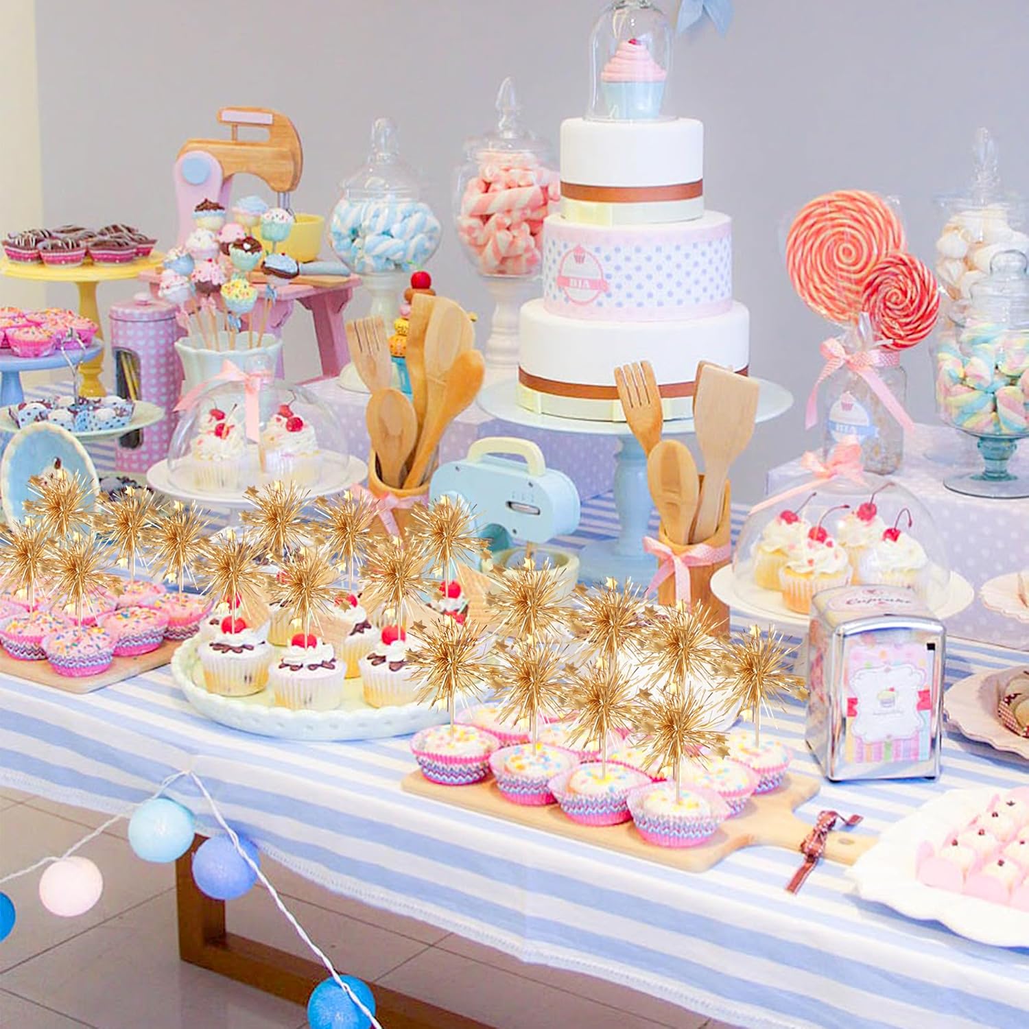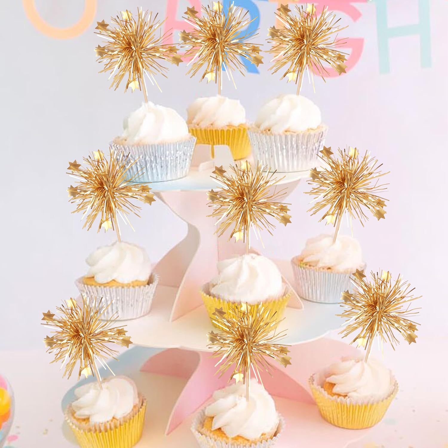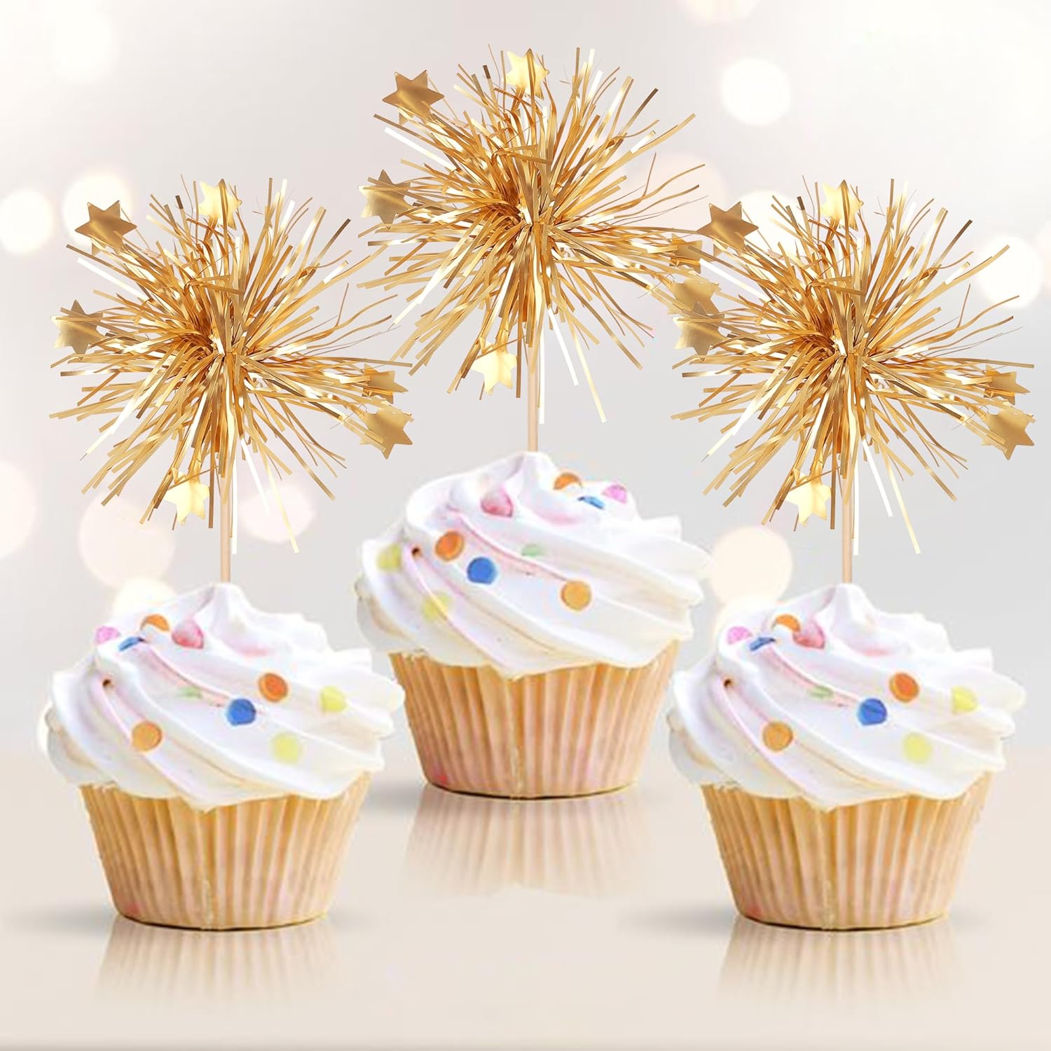30 PCS Foil Firework Cupcake Toppers Happy Birthday Cake Toppers Star Sparkle Tinsel Flower Drink Stirrers Cocktail Fruit Toothpicks for Valentine's Day Baby Shower Birthday Party Supplies Gold