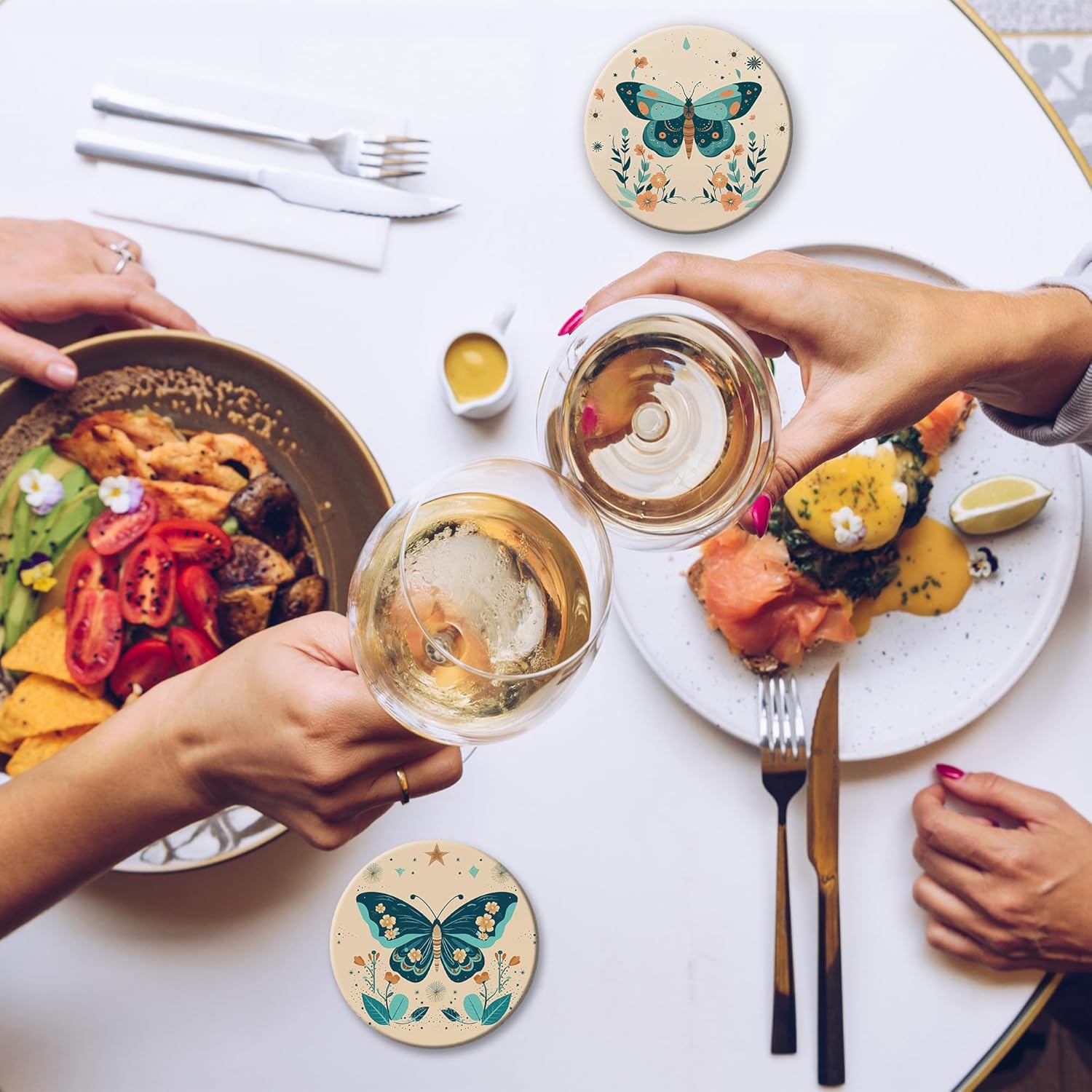 Coaster for Drinks Set of 6, Boho Butterfly Flower Absorbing Round Ceramic Stone Coaster with Cork Base,Tabletop Protection Mat for Mugs and Cups,Coffee Table Wine Glass Home Bar 4 Inch