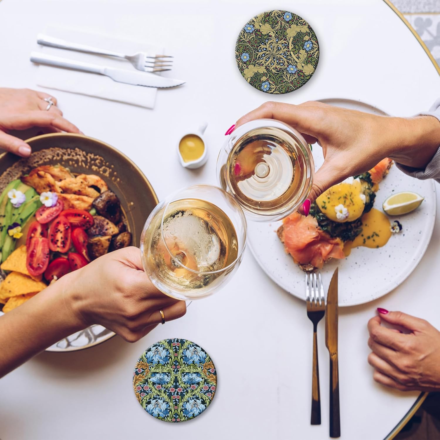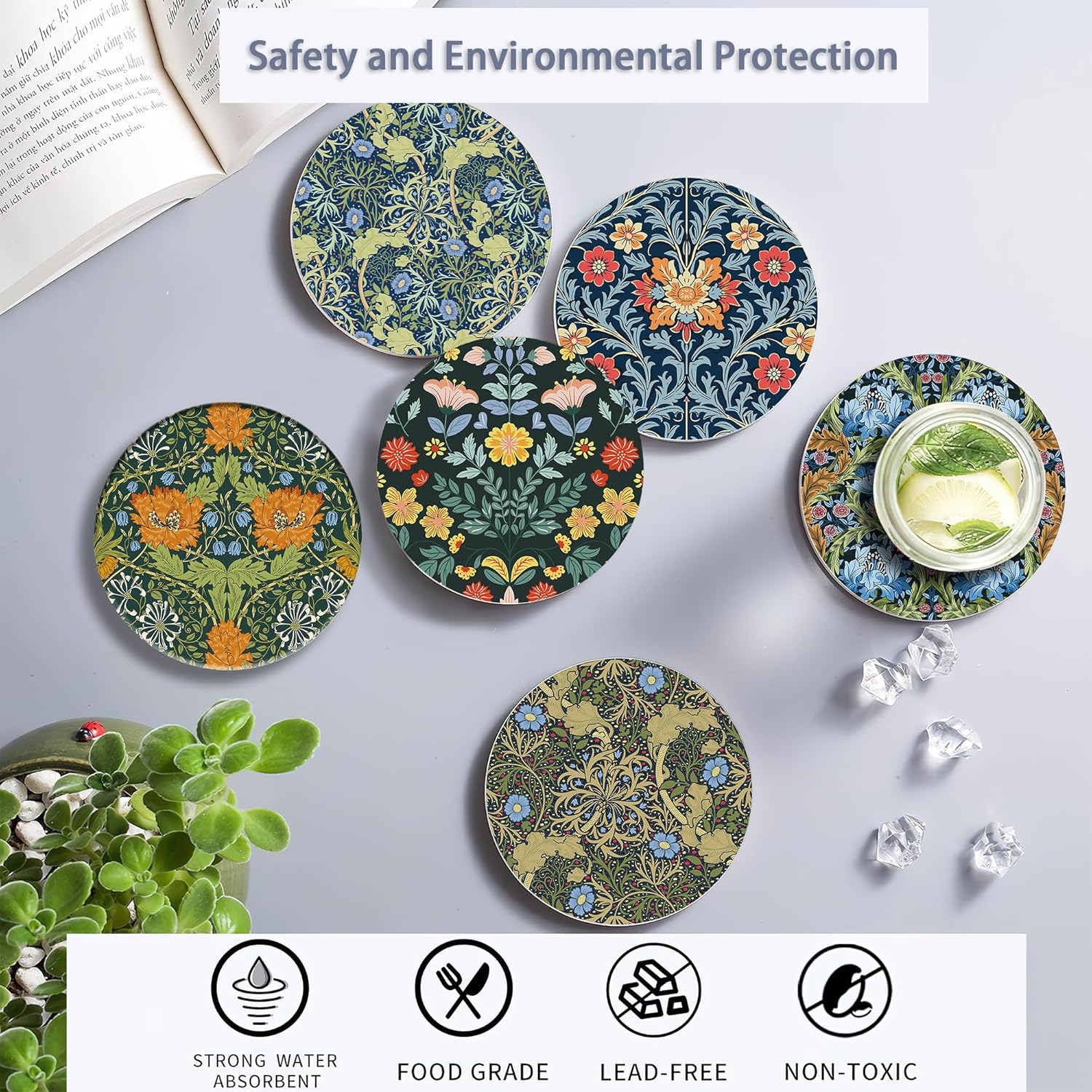 - Husiti Ceramic Coasters Set With Metal Holder: Keep Your Dining Table Stylish And Organized With This Set Of 6 4-Inch Round Coasters Featuring a Trendy Vintage Flower Pattern.