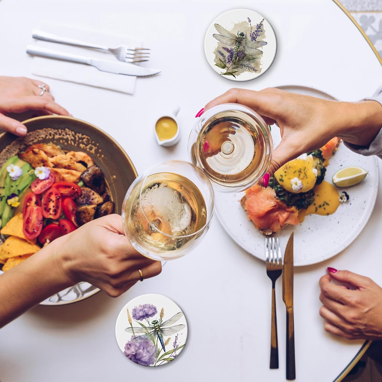 Coaster for Drinks Set of 6, Dragonfly Flower Absorbing Round Ceramic Stone Coaster with Cork Base,Tabletop Protection Mat for Mugs and Cups,Coffee Table Wine Glass Home Bar 4 Inch