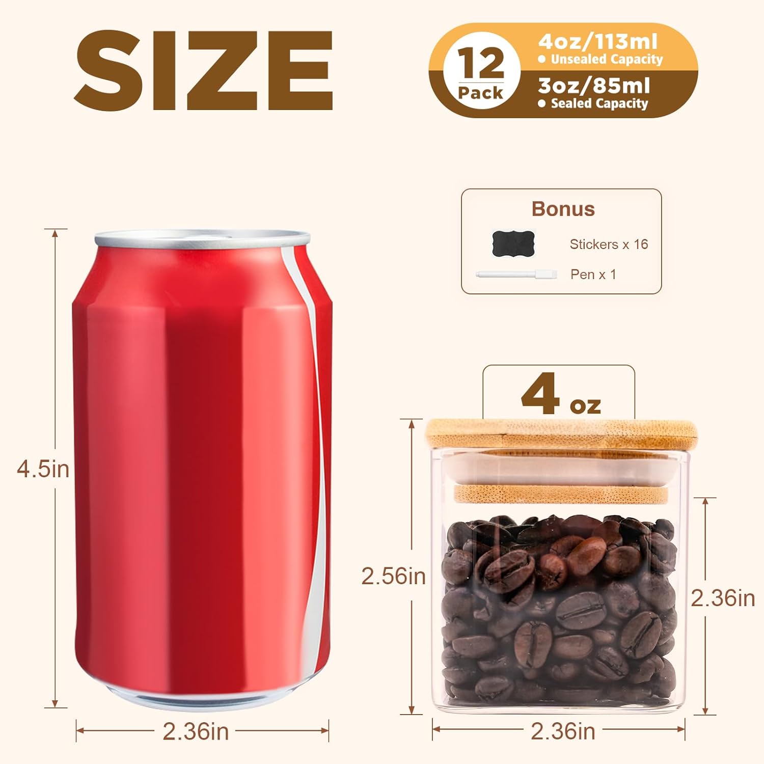 Glass Food Storage Jars Square 4oz, 12 Pack Glass Jars With Bamboo Lids, Kitchen Storage Containers For Spice, Candy, Cookie, Storage For Pantry Organizers