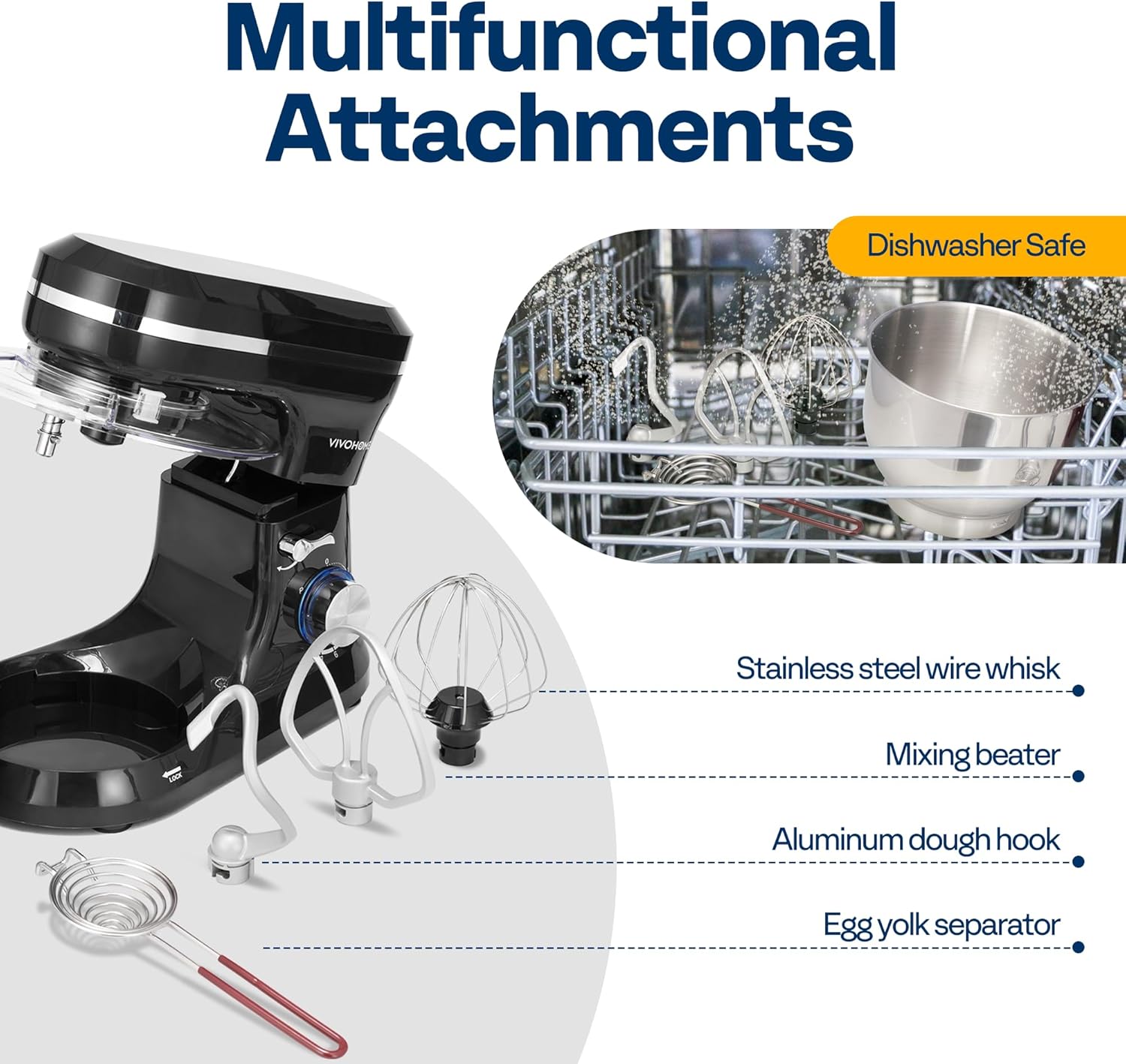 - MULTIFUNCTIONAL ATTACHMENTS: Includes 4 durable, multipurpose accessories: a stainless steel wire whisk, an aluminum dough hook, a mixing beater, and an egg yolk separator; These versatile tools meet various kitchen needs, from making dough to preparing biscuits, pastries, muffins, and waffles; All attachments, except for the lid, are dishwasher-safe for quick and easy cleaning