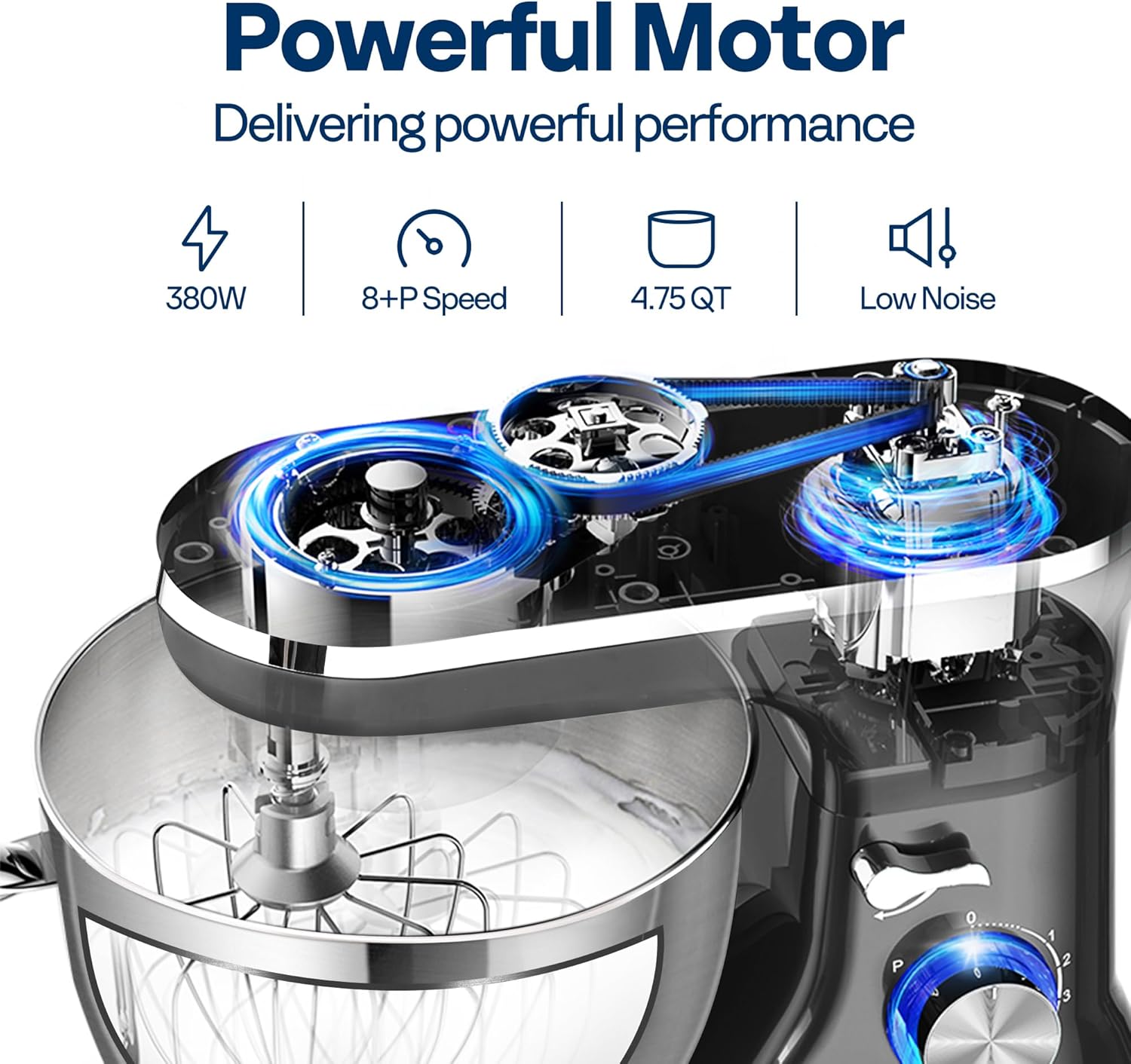 - POWERFUL MOTOR: Equipped with a high-performance 380-watt motor, this stand mixer ensures effortless and consistent whipping, beating, kneading, and thorough mixing; The all-metal gears provide stability and quiet operation (noise level ≤ 76dB); The planetary mixing design moves the beaters around the bowl for even and thorough mixing