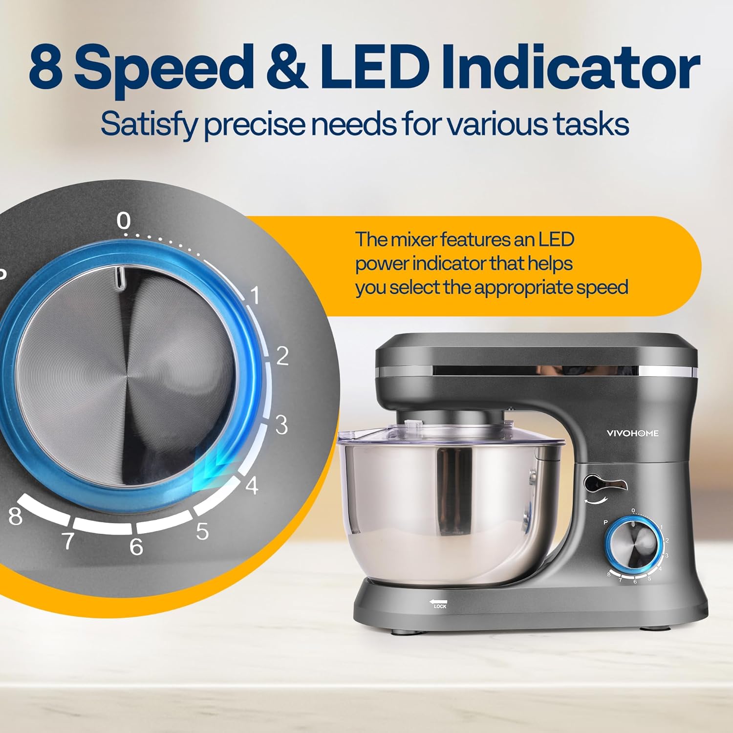 - 8 SPEED SETTINGS & LED INDICATOR: Handy 8-speed control meets the precise needs of various mixing tasks; Whether you’re mixing fine flour, thick dough, or eggs, you’ll find the right speed; The pulse function delivers powerful bursts for better control, ideal for breaking down large chunks and preventing overmixing; The mixer includes an LED power indicator to help you select the correct speed; Suction cups on the base keep the kitchen mixer securely in place