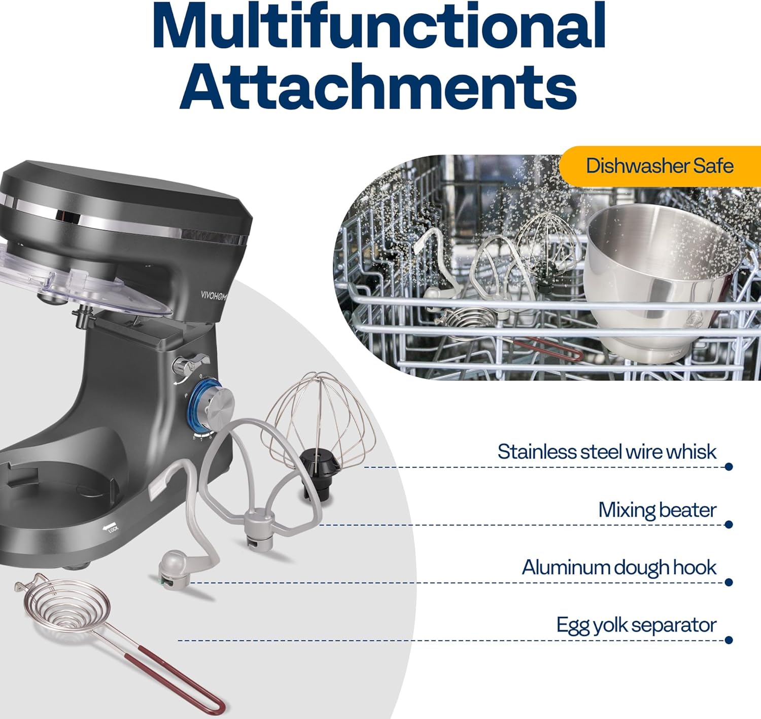- MULTIFUNCTIONAL ATTACHMENTS: Includes 4 durable, multipurpose accessories: a stainless steel wire whisk, an aluminum dough hook, a mixing beater, and an egg yolk separator; These versatile tools meet various kitchen needs, from making dough to preparing biscuits, pastries, muffins, and waffles; All attachments, except for the lid, are dishwasher-safe for quick and easy cleaning