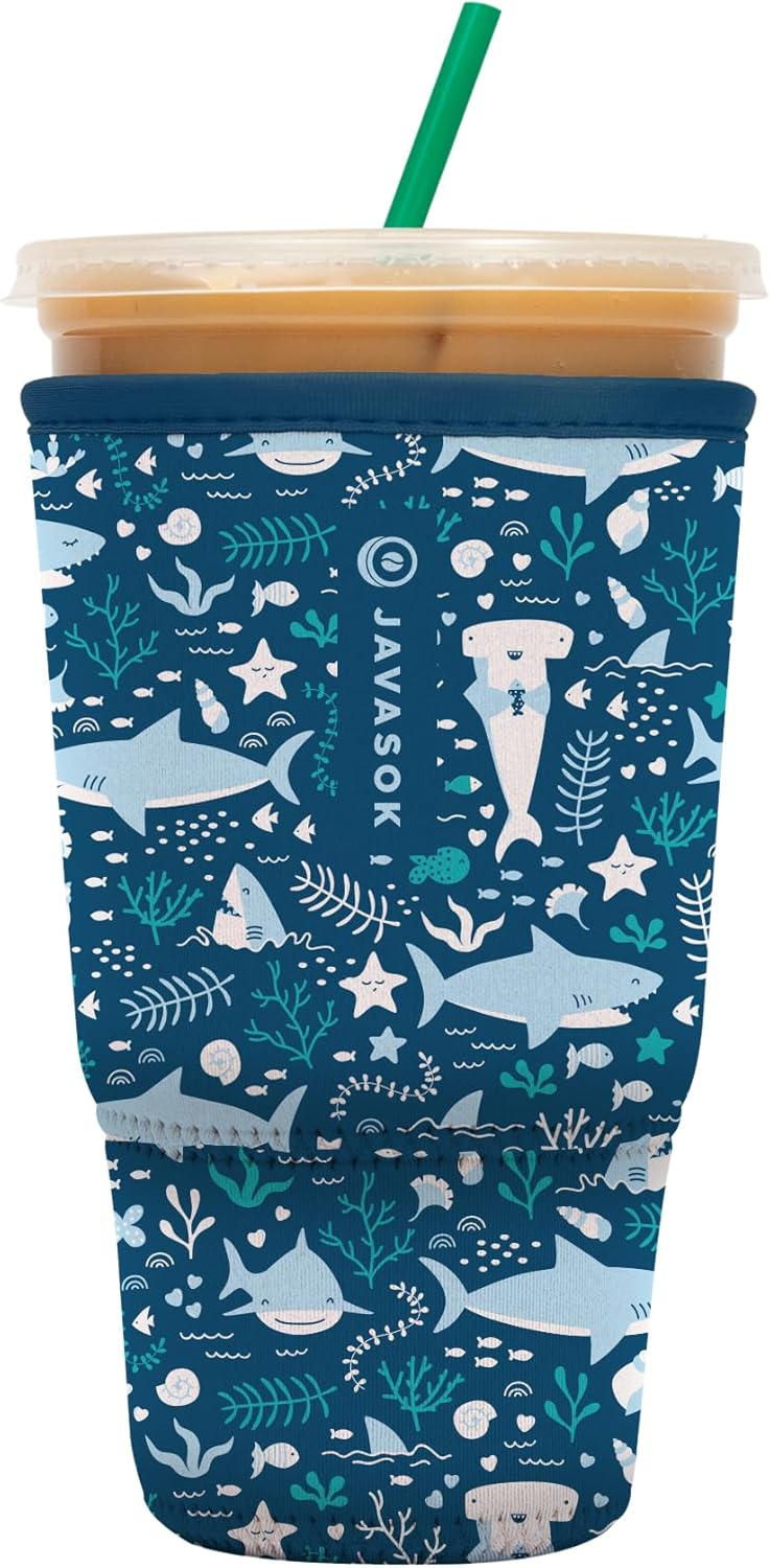 Sok It JavaSok Iced Coffee & Cold Soda Insulated Neoprene Cup Sleeve (Happy Sharks, XLarge: 38-42oz)