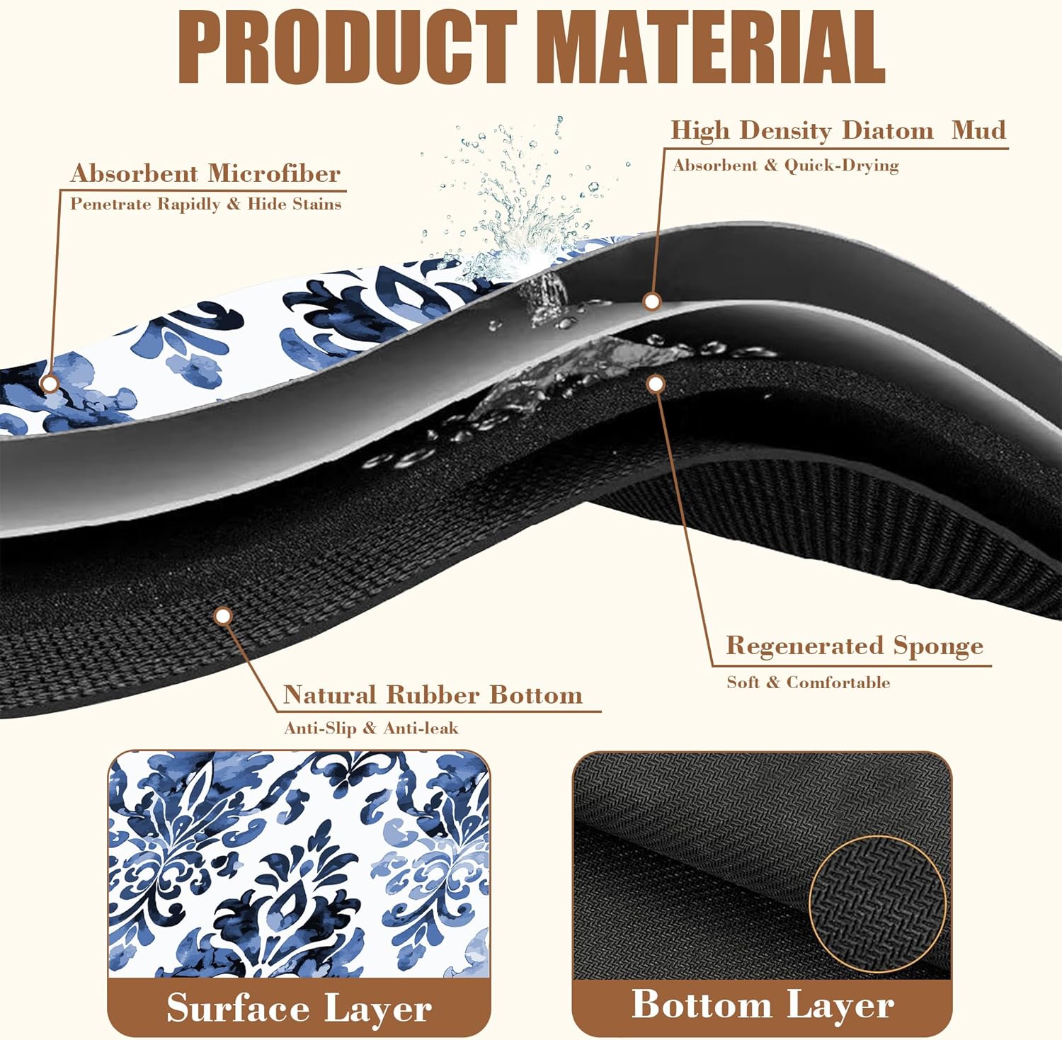 Blue Damask Flower Dish Drying Mat for Kitchen Counter Bar Mat Hide Stain Absorbent Rubber Backed Coffee Maker Espresso Machine Bar Accessories 11.8 x 19.7 Inch