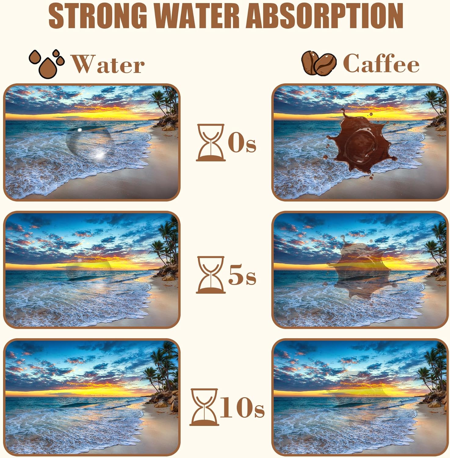 - 【Absorbent & Quick-Drying】The surface of this coffee mat is made of absorbent microfiber and the middle is made of composite sponge, which can absorb up to 4 times its weight in water and has a strong water absorption capacity. The high-density design makes it fast drying and can quickly absorb spilled liquids to keep your counter or desktop dry