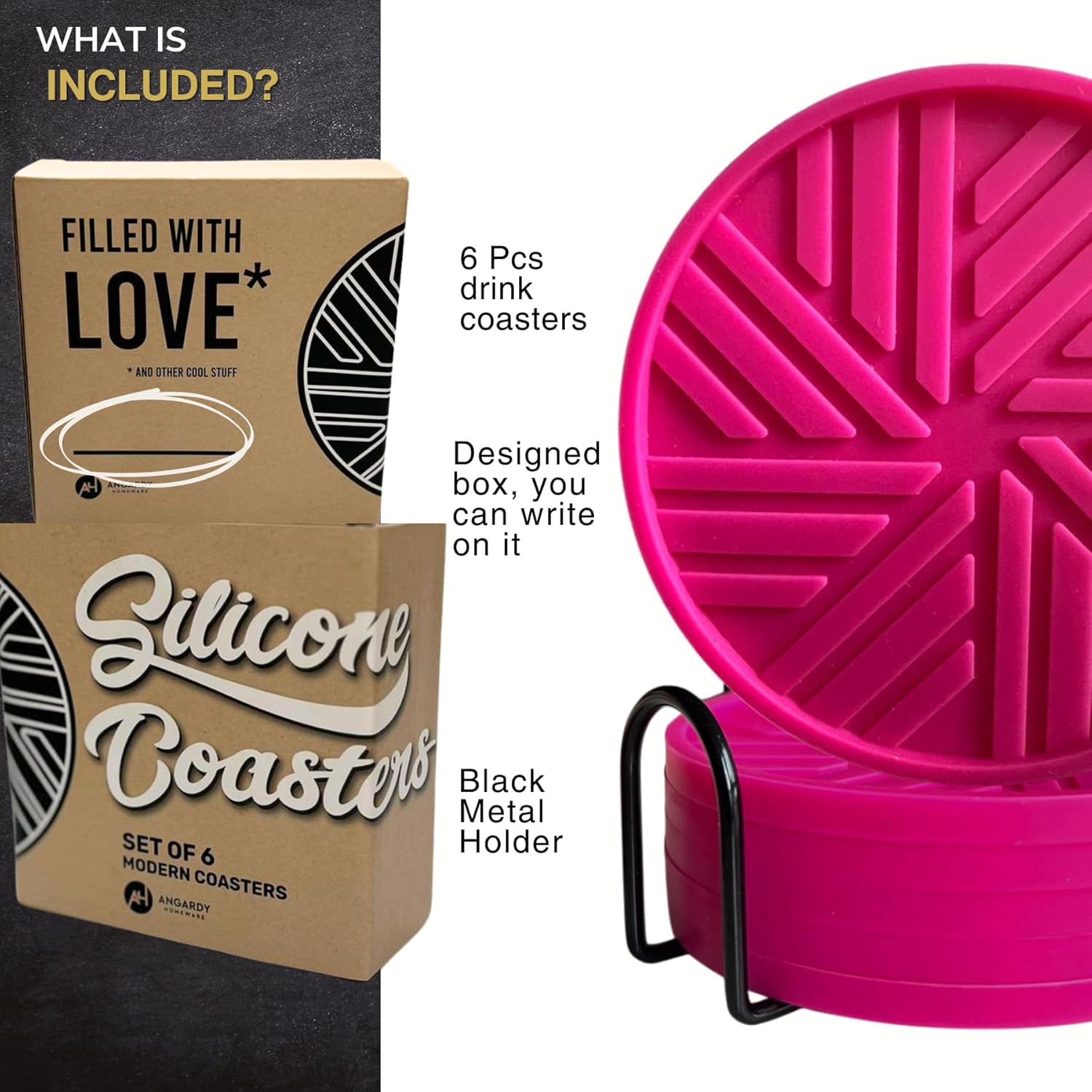 - NO MORE PUDDLES - When you purchase the set, you get six pink coasters for drinks that are 4" in diameter and 0.23" thick. You also get a gold metal stand for storing the pads when they're not in use in your living room and design box perfect for gift. Our minimalist drink coasters have elegant, grooved patterns that collect condensation from your cold drinks. Now you don't have to worry about liquid spilling over into your table, teal desk.
