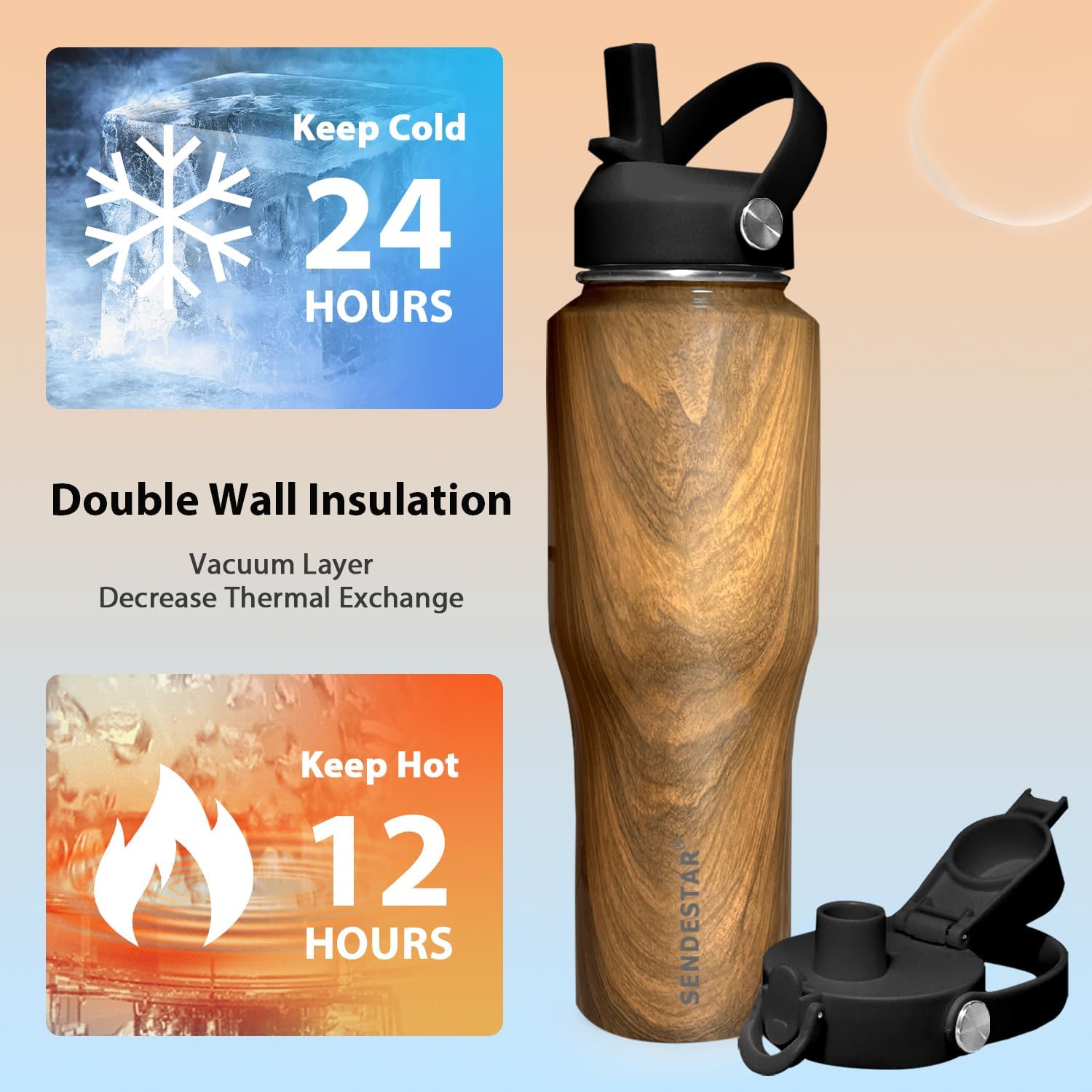 - 【NEW DESIGNED STYLE BOTTLE】 SENDESTAR 32oz water bottle W/slim outline is designed new,the largest vacuum capacity thermos flask can fit in any standard cupholder,perfect for outdoor activities especially for driving,field trip,beach,camping,cycling,etc