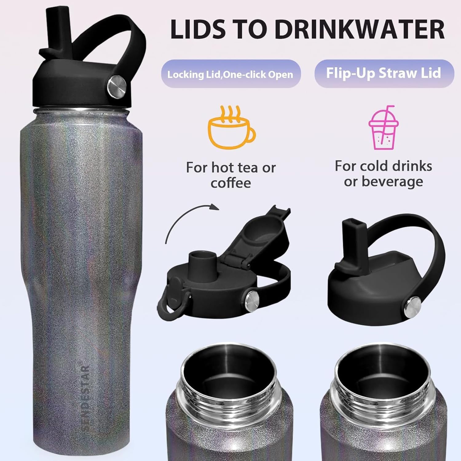- 【VACUUM INSULATED】 Unique technology inside SENDESTAR 40oz water bottle keeps cold drink icy for up to 48 hours and hot beverage steaming up to 24 hours, make sure your every sip is the feeling you want. Excellent leak proof sealing lid prevents leakage so that you can just grab and go.