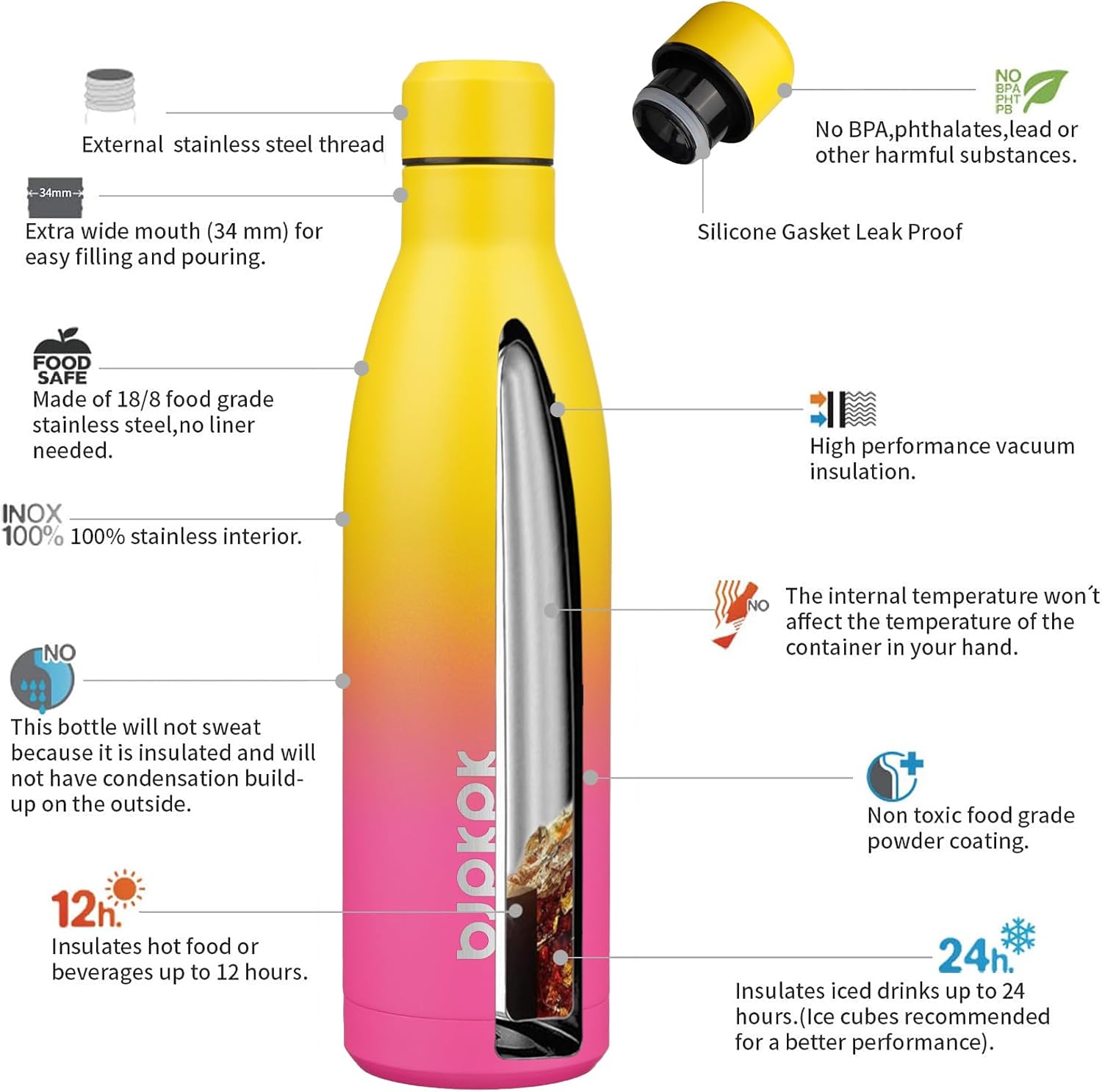 - Keep Drinks Cold & Hot: Adopt double wall vacuum insulation design, keep your drinks ice cold for 24 hours and hot for 12 hours within our highly performed insulated water bottle