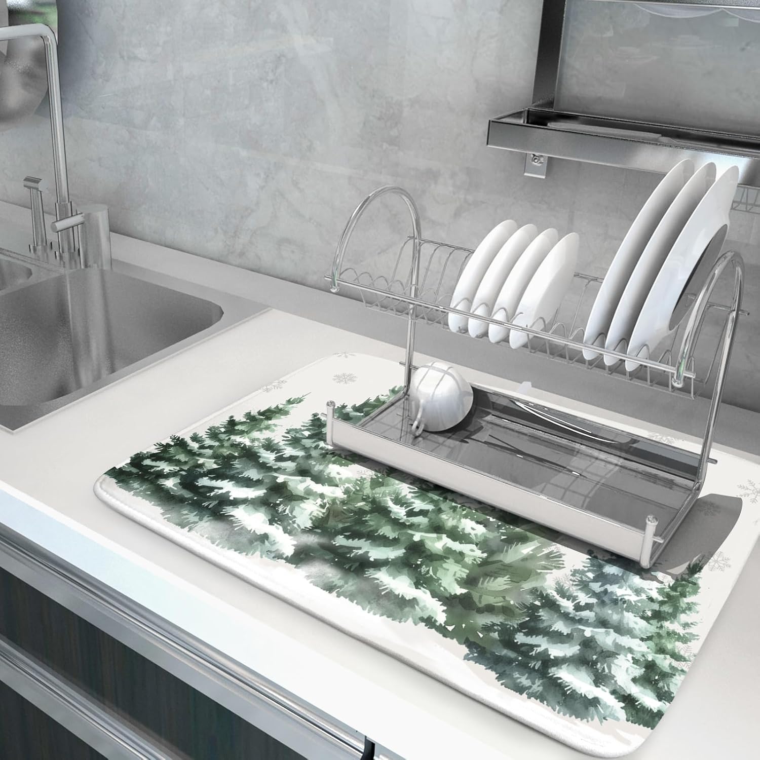 - 【Fashion Design】Our christmas drying mat for kitchen counter is customized with single-sided printing, one side is takes christmas as theme, printed with winter green pine trees, snowflakes and white snowfield pattern, does not fade, perfect functional addition to your kitchen decor, fitting well and tightly on most counters. Prepare the best holiday present for family and friend, housewarming parties, weddings, birthdays, Halloween, Christmas and Thanksgiving Day.