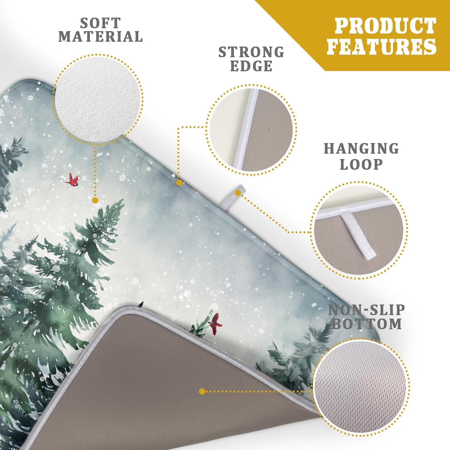 - 【Dish drying mat】The winter pine tree dish drying mat is 16x18inch/18x24inch, which is suitable for most homes and kitchen countertops while providing a smart and sharp look. Our dish drying mat is soft and durable, can be used as a drying mat, put down all sizes of kitchen tableware, also can be used as a protective pad, dish mat, cup mat, heat insulation pad for countertop for heat insulation and ironing, which can perfect hold your dishes, plates, big pots and pans.