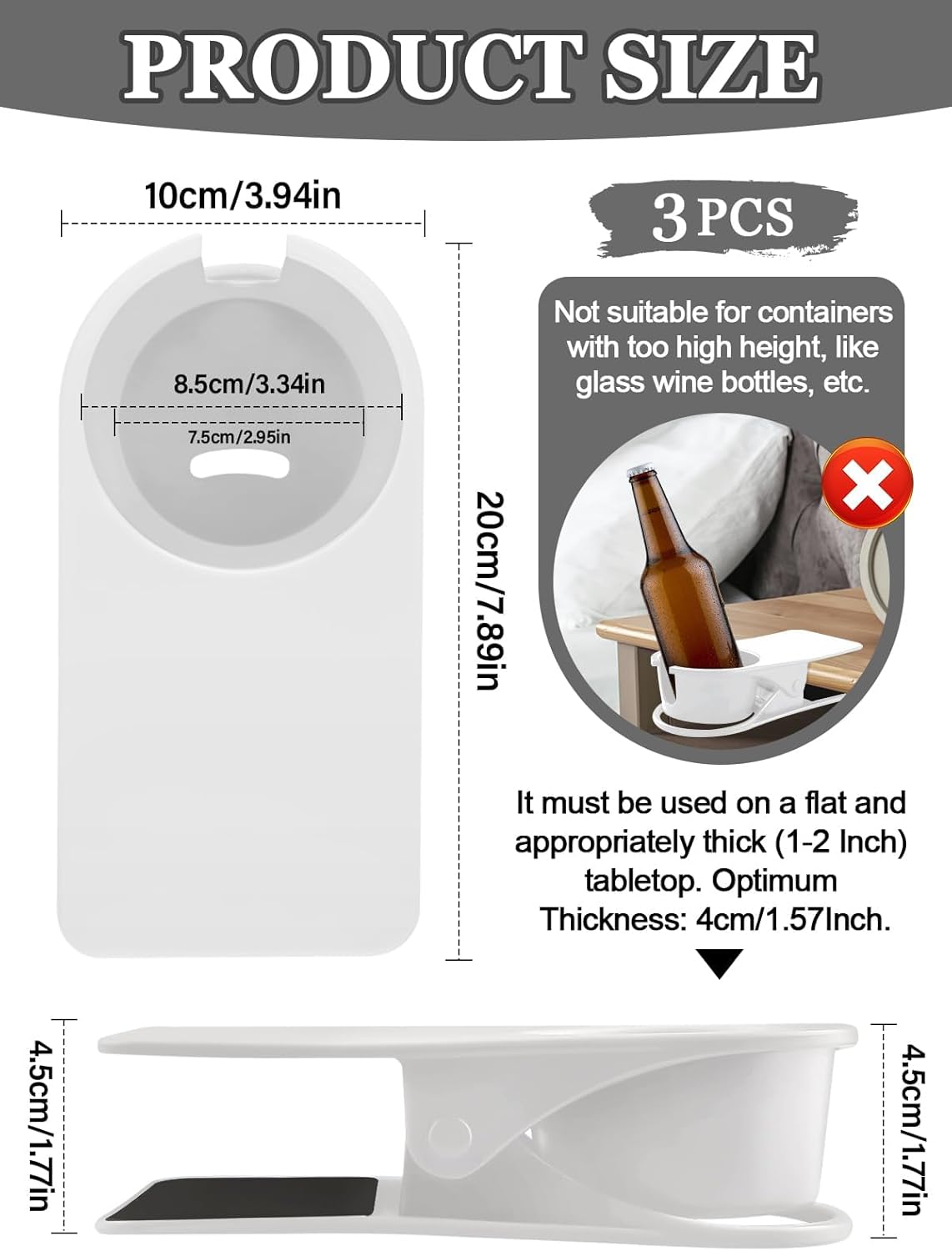 - ⚪ Keep Your Desktop Tidy: This cup holder clamp has an opening of 3.3 inches and can bear 1 kg. It can be clamped on tables with a 15"~2.5" thickness, and is more suitable for thicker surfaces above 4cm/1.57". It is ideal for placing drinks, mobile phones, plants, etc. In addition, it can also be used in classrooms, game rooms, hospitals, and on buses and trains. It is your right-hand helper to keep your desktop tidy!
