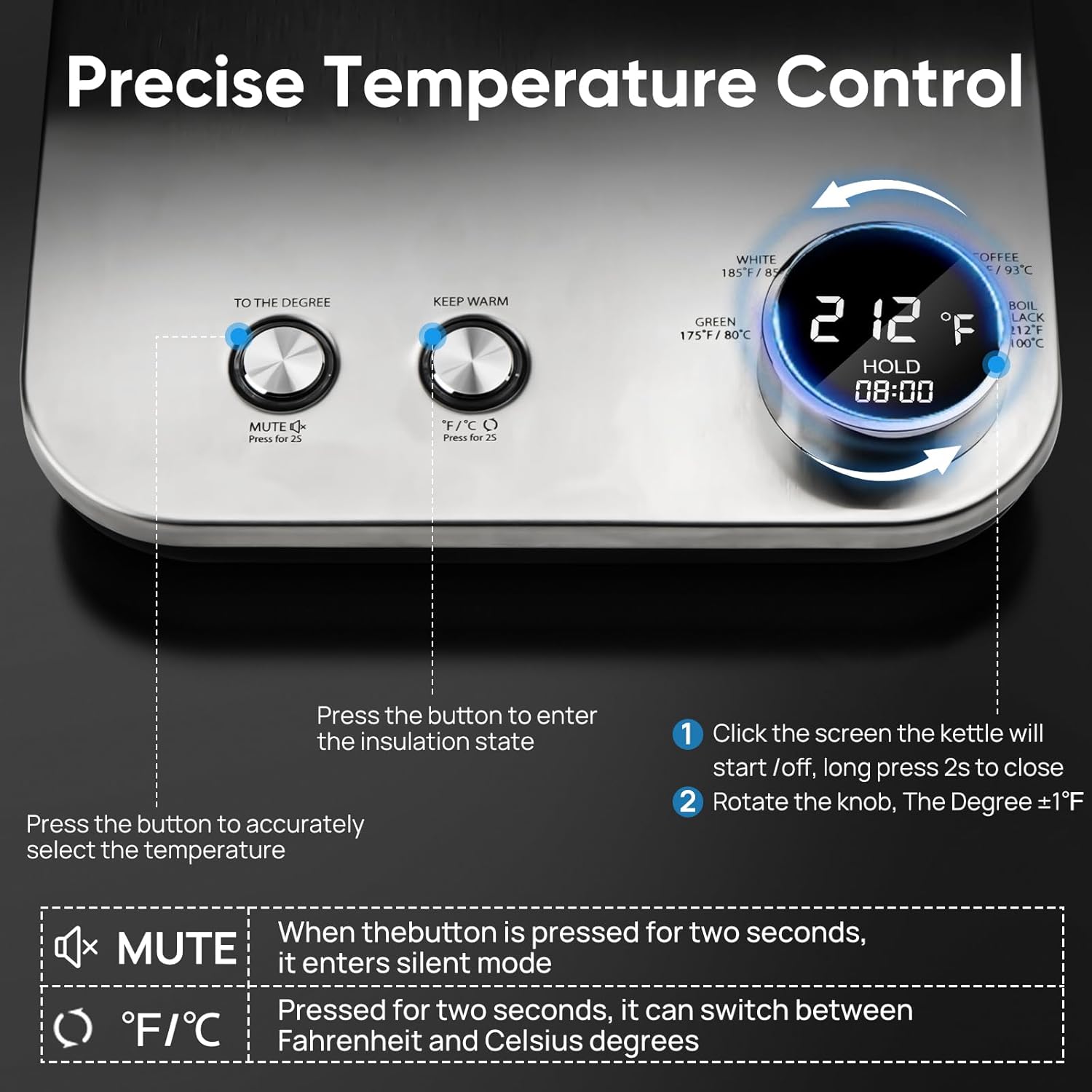 - Temp Setting Knob/Button: The heated base of the gooseneck coffee kettle has a temp setting button knob and two buttons, two buttons to keep warm and Fahrenheit/Celsius convert. The Fahrenheit/Celsius convert button also acts as a MUTE button. LCD display to show the realtime temperature and set temperature, and other information like hold time, mute mode, heating status, stopwatch. You will be able to see any information you set on the display