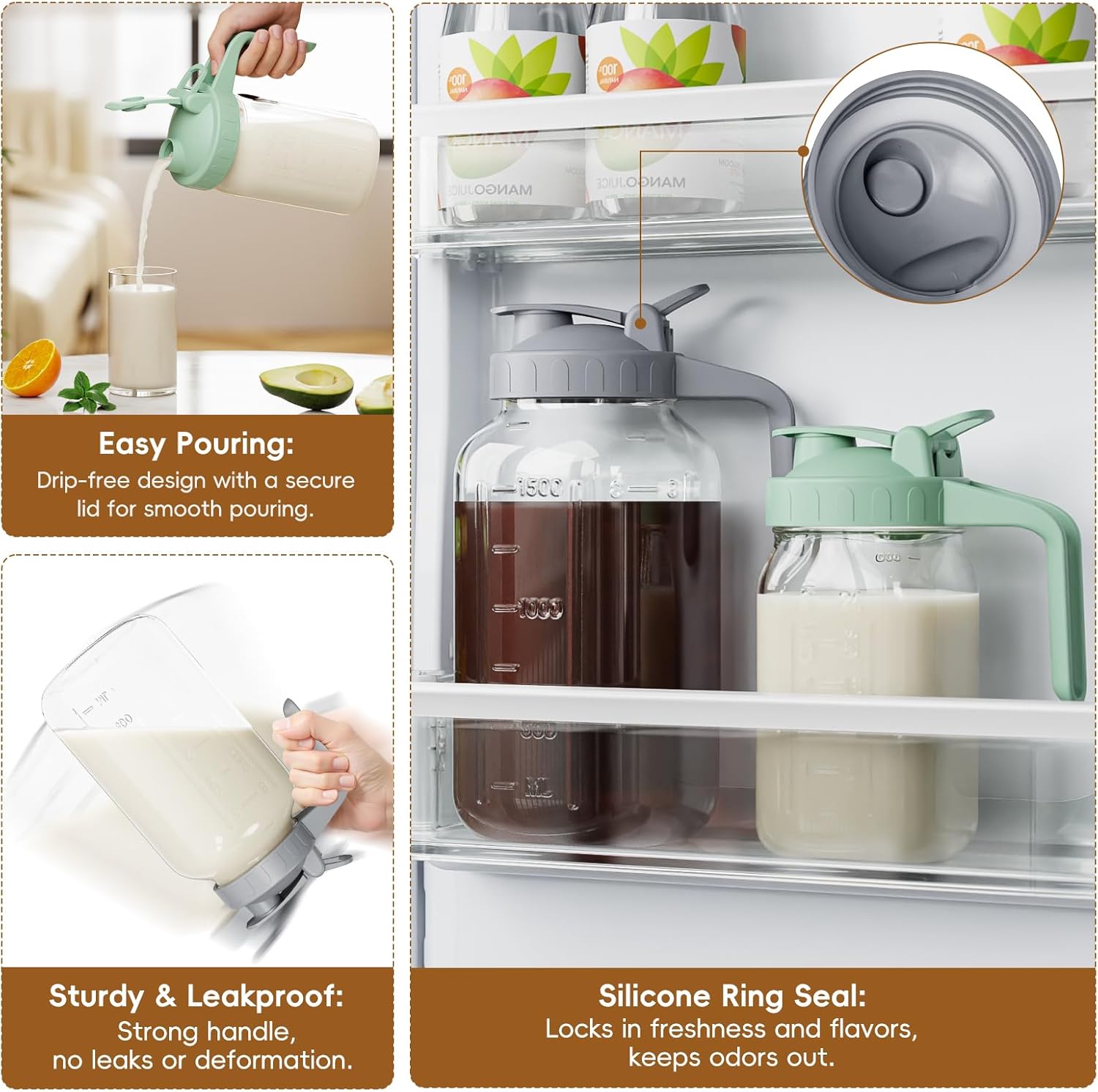 - 【Spout Sealed Lid with Handle】 - The 32oz jug with silicone seal in the pour spout lid, Leak proof and better maintain the freshness and taste of the beverage, avoid mixing the smell of other foods in the fridge. The flip-top lid is easy to pour and the jug is securely fastened to the lid