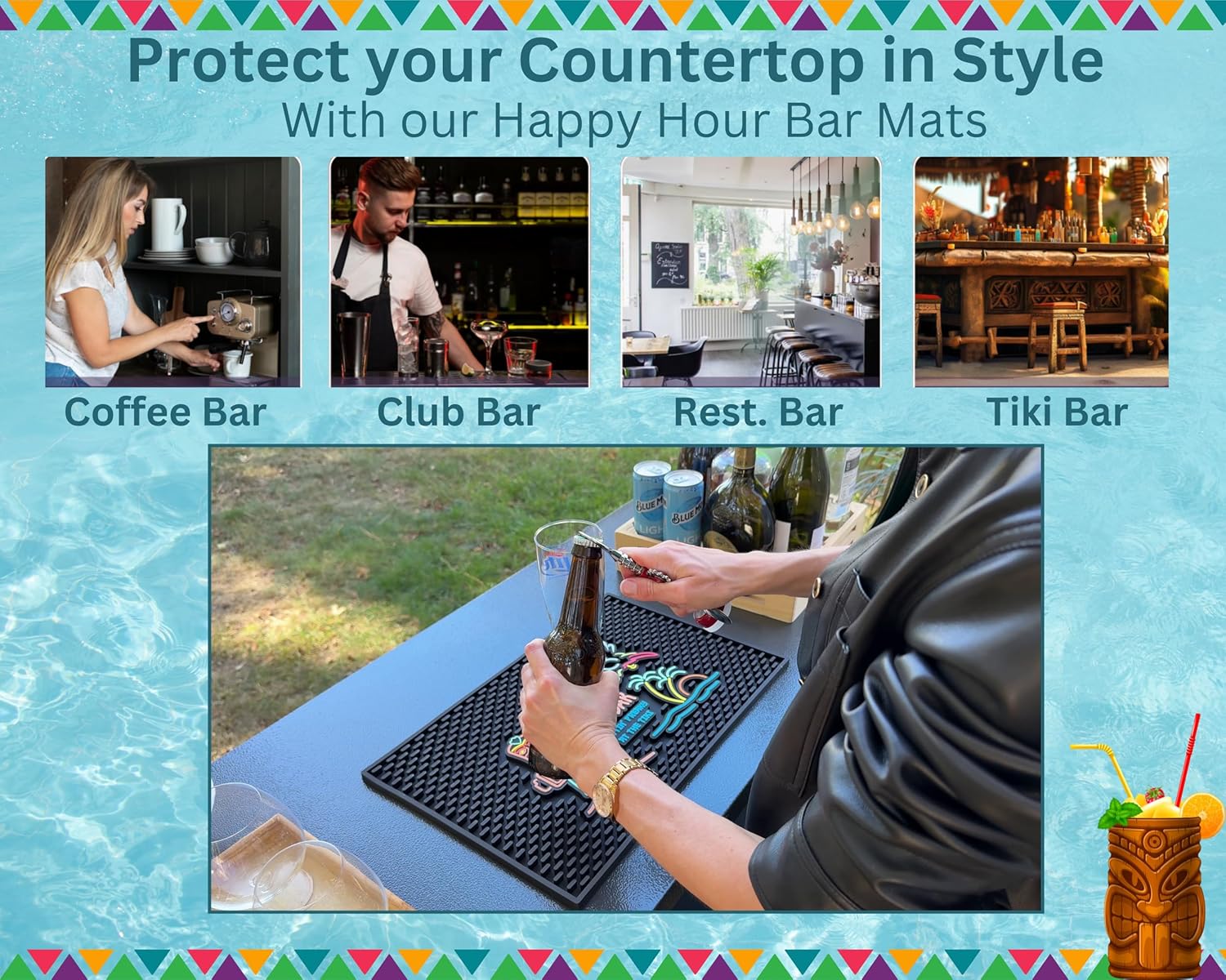 - Tiki-tastic Bar Essential: This unique bar mat features a Tiki Man Warrior holding an "Aloha" sign, with palm trees, waves, and a flying parrot, making it the ultimate piece for tiki decorations bar essentials and bar mats for bartending.