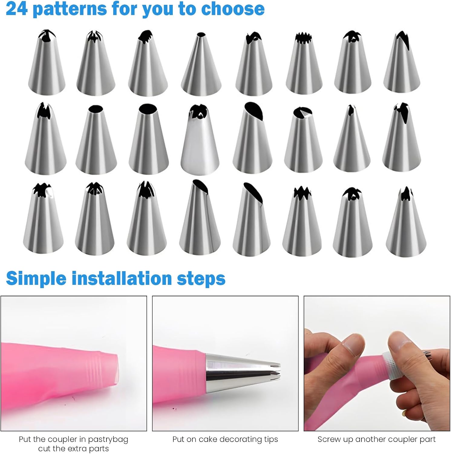 - Materials: The pastry bag is made of food-grade silicone, the nozzle for the cake decorating kit is made of 18/8 stainless steel, ensuring durability and never rusting, BPA-free, safe for contact with food.
