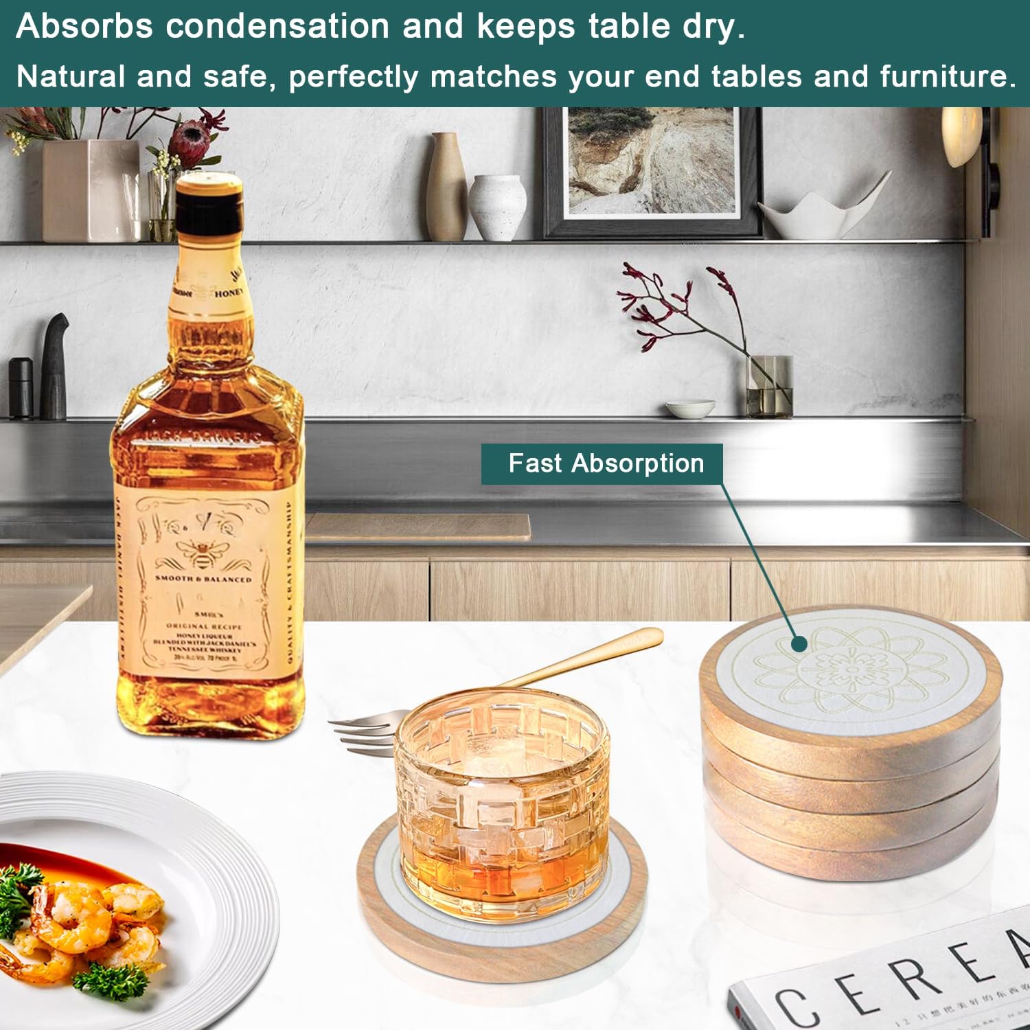 5 Pack Wood Coasters for Drinks, Minacun Absorbent Coaster Set, Drinks Coasters for Coffee Tabletop Protection, Non-Slip, Non-Stick, Suitable for Kinds of Cups Wooden Table Drink, 4.3 Inch White