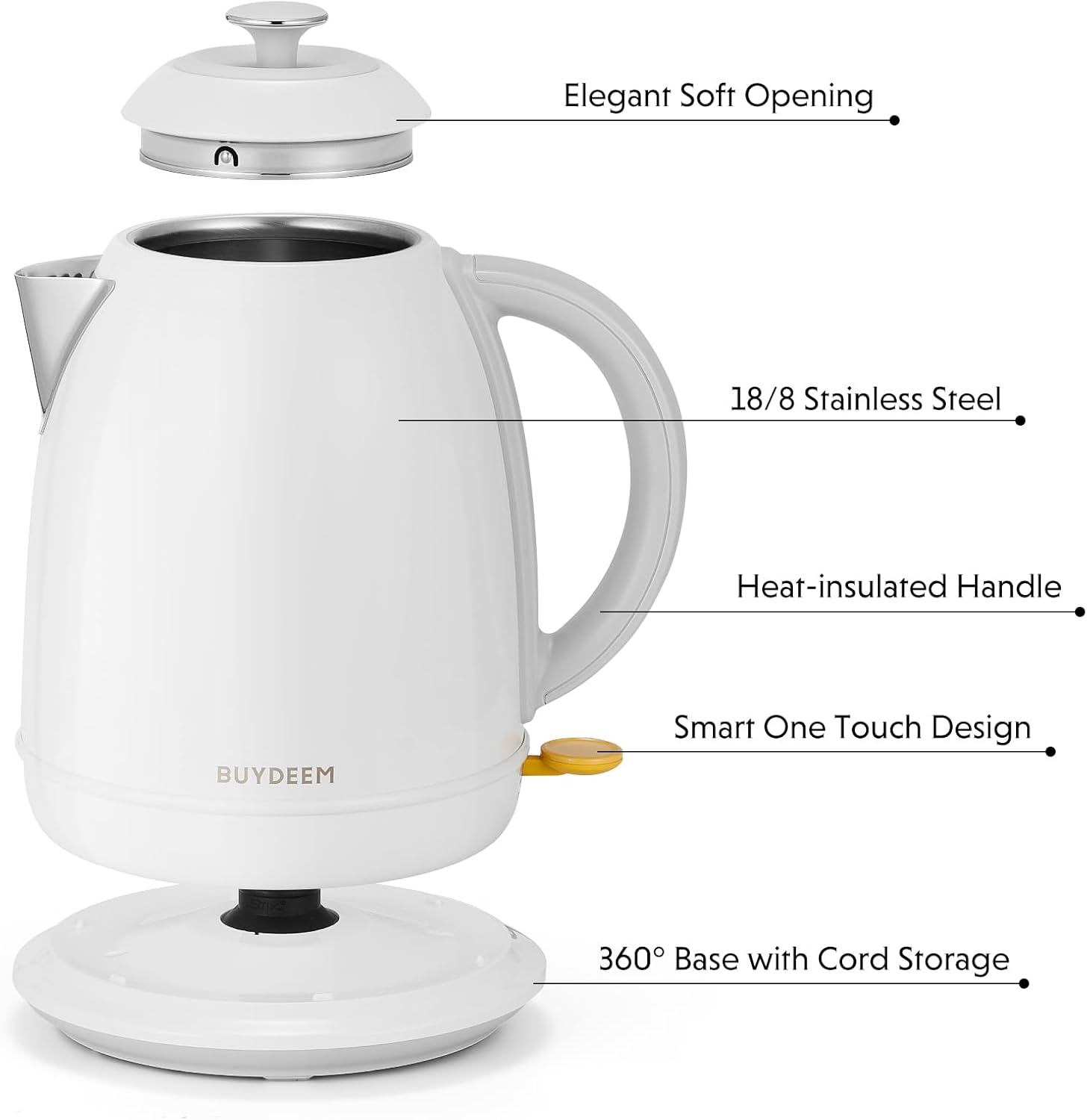 BUYDEEM K640 Stainless Steel Electric Tea Kettle with Auto Shut-Off and Boil Dry Protection, 1.7 Liter Cordless Hot Water Boiler with Swivel Base, 1440W, Arctic White