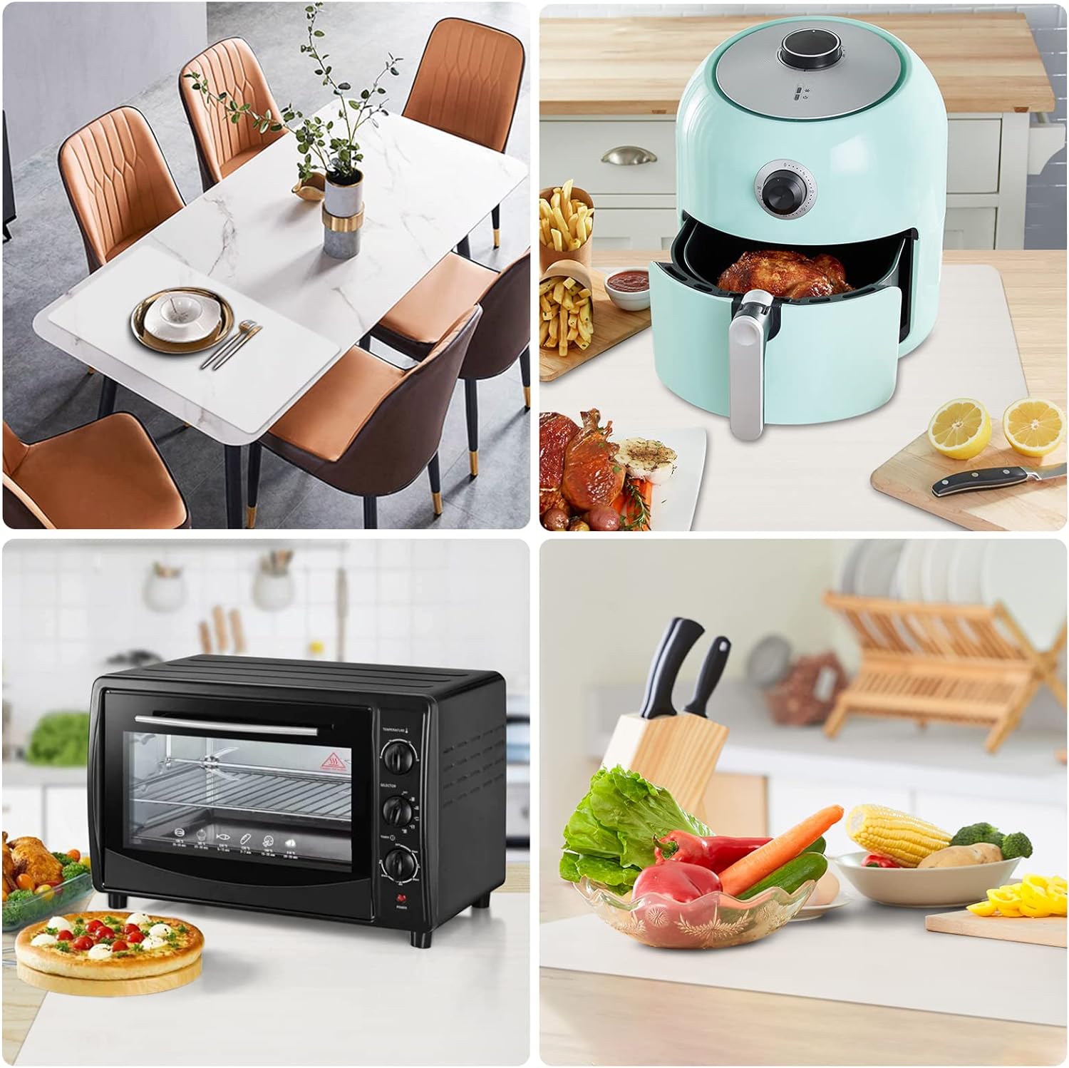 - Extra large silicone mat: Size of 120” x 48”, almost can fit most kitchen countertops, dining tables and other workbench. It can be placed under the air fryer, microwave, toaster oven, induction stove, coffee maker to protect the kitchen countertops and other surfaces against spills, scratches, grease, heat, etc. It’s cuttable to fit different sizes and shapes.
