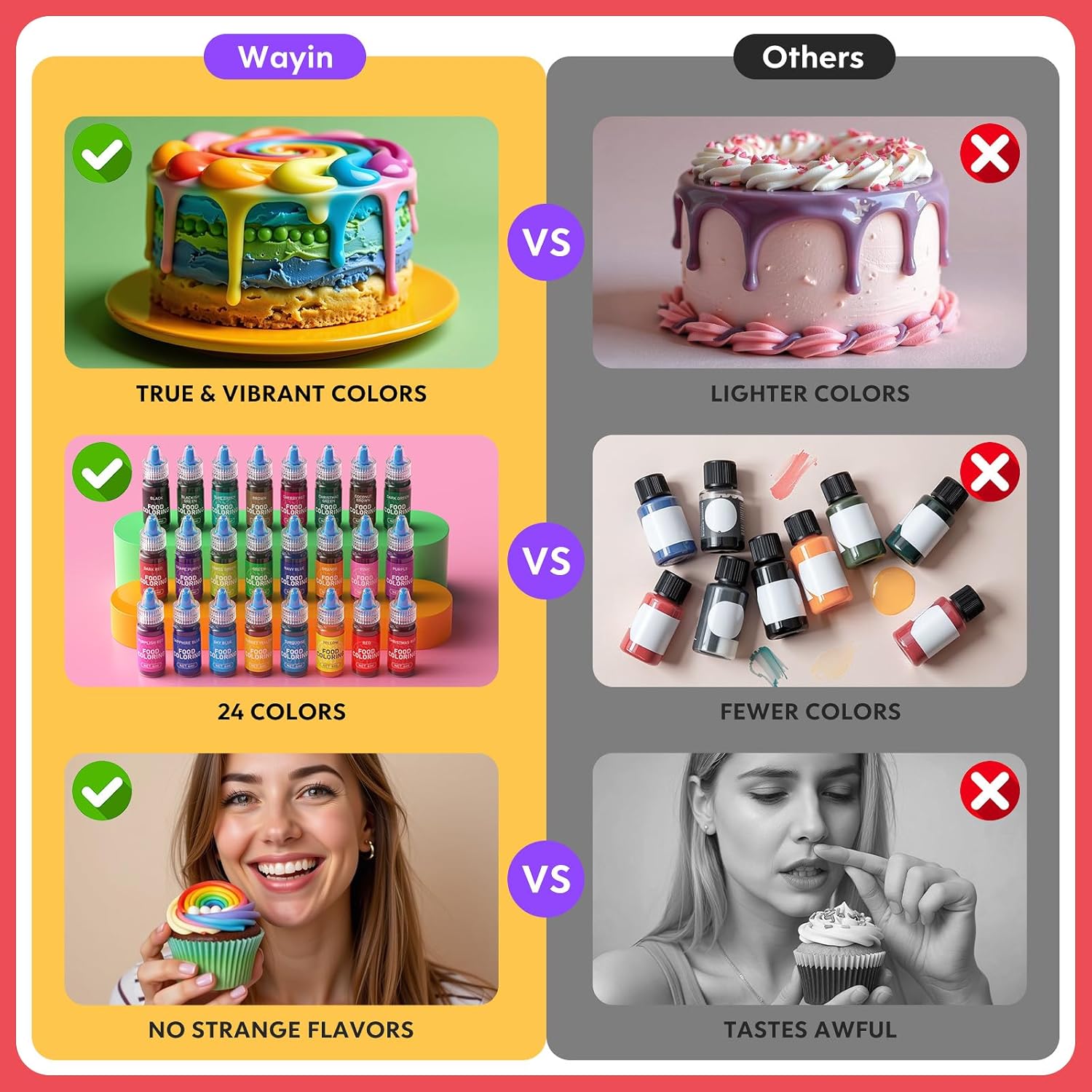 - 𝗠𝗦𝗗𝗦 Safety Certification :Wayin food coloring is crafted from food-grade, guaranteeing that every drop is safe, non-toxic, and tasteless.This allows you to enhance your desserts with vibrant colors without altering their original flavors, ensuring treats like macarons and buttercream frostings remain delicious and authentic. Designed with safety in mind, Wayin formula is perfect for homes with children and families, providing peace of mind for birthday parties or family gatherings